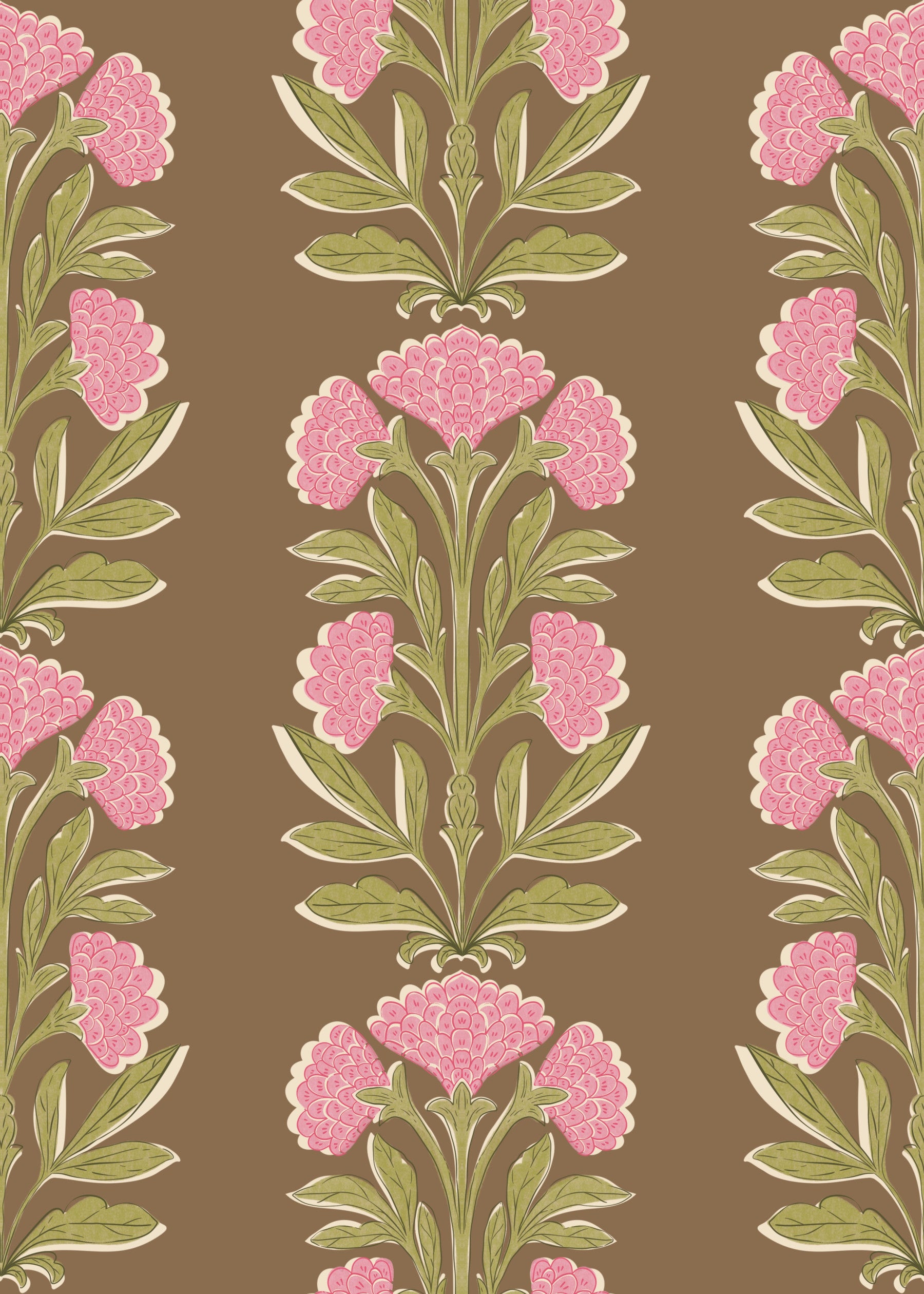 Bring vintage charm to any room with this floral design. The wallpaper showcases blooming pink flowers and green leaves against a warm, brown backdrop. The hand-drawn style offers a sophisticated nod to vintage aesthetics. Use this wallpaper for walls in spaces like the living room or bedroom to create a warm, cosy ambiance. It adds a touch of sophistication, making it perfect for creating a relaxing retreat. This design complements interiors with a touch of the past.