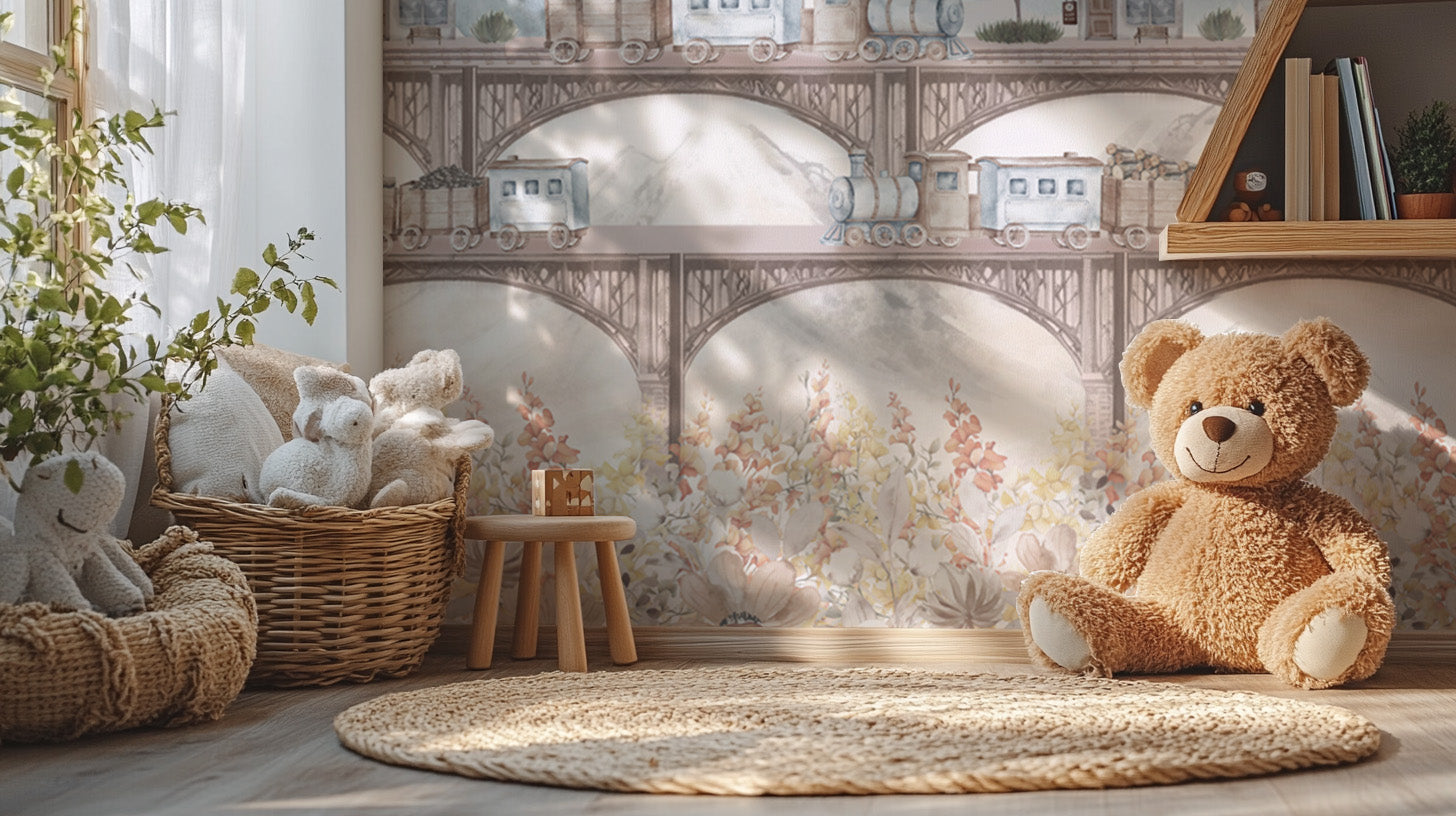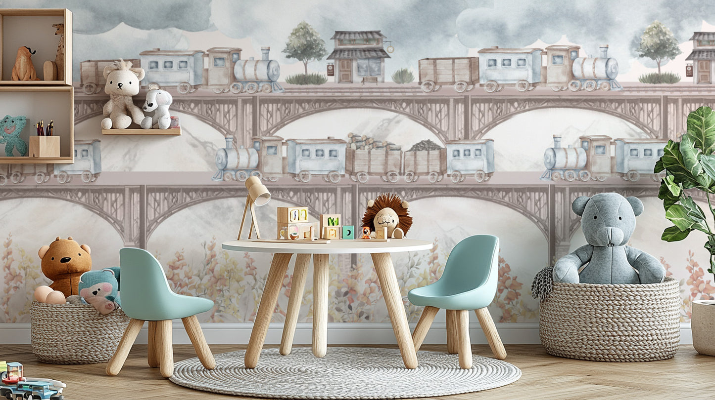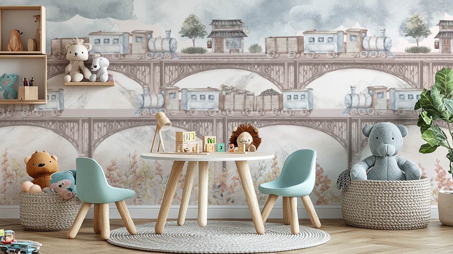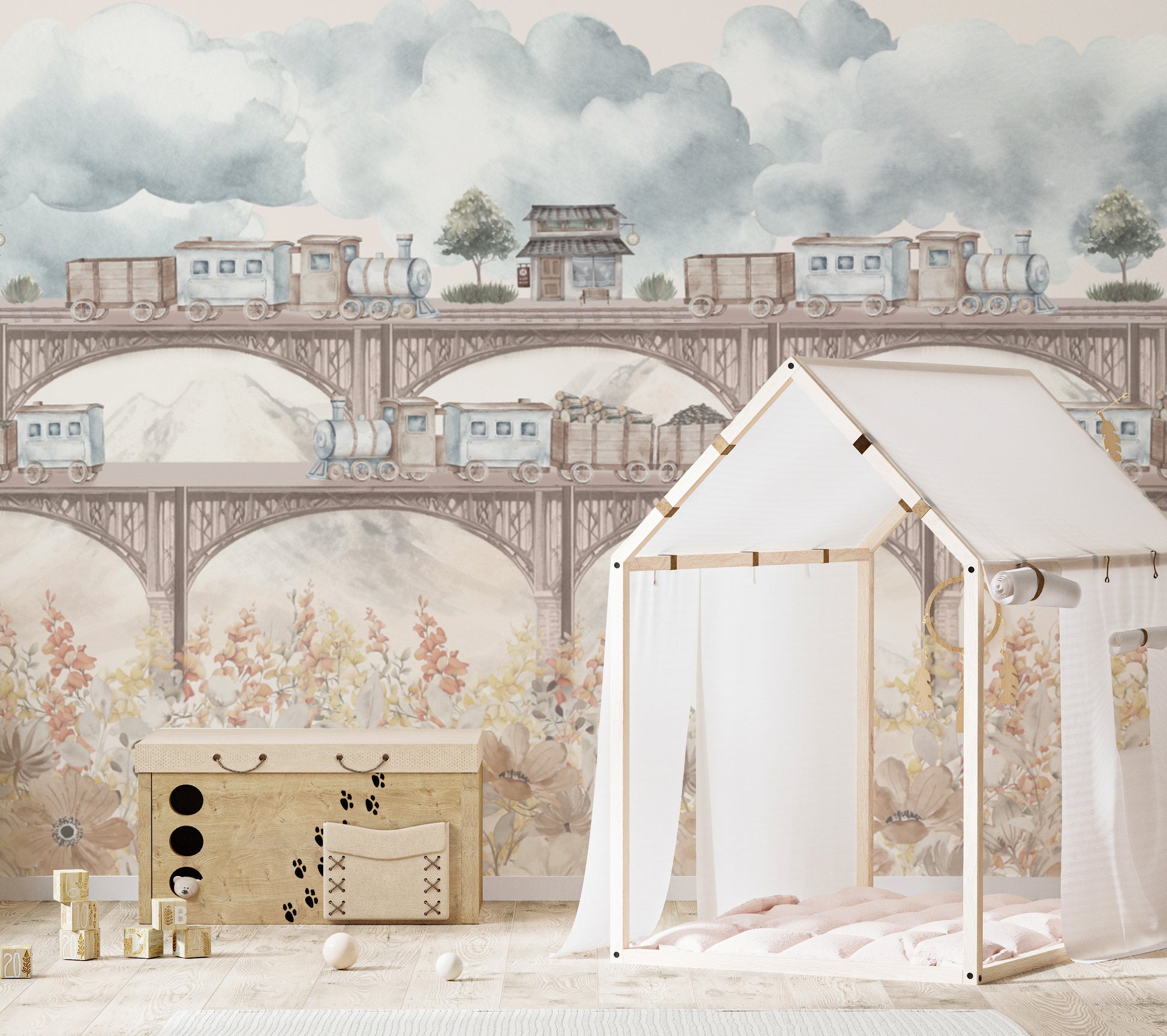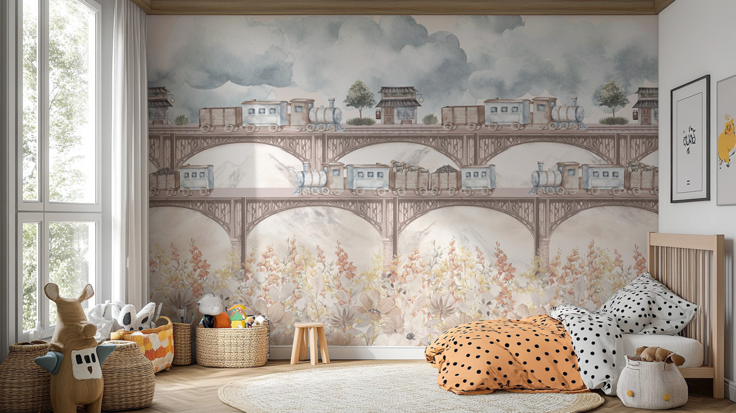 The vintage floral train wallpaper brings nostalgic charm to steam trains crossing intricate railway bridges. Delicate wildflowers in warm tones blend with muted blues and earthy browns, creating a classic countryside setting. The hand-drawn details of the steam train railway wallpaper capture the romance of old-fashioned travel. Rolling mountains and a soft, cloudy sky add depth, making this an ideal watercolor train mural for those who love adventure and history. The floral accents enhance the rustic beauty, combining nature with vintage locomotives. This floral train wallpaper mural creates a timeless, countryside-inspired atmosphere.