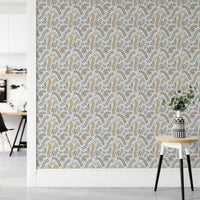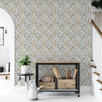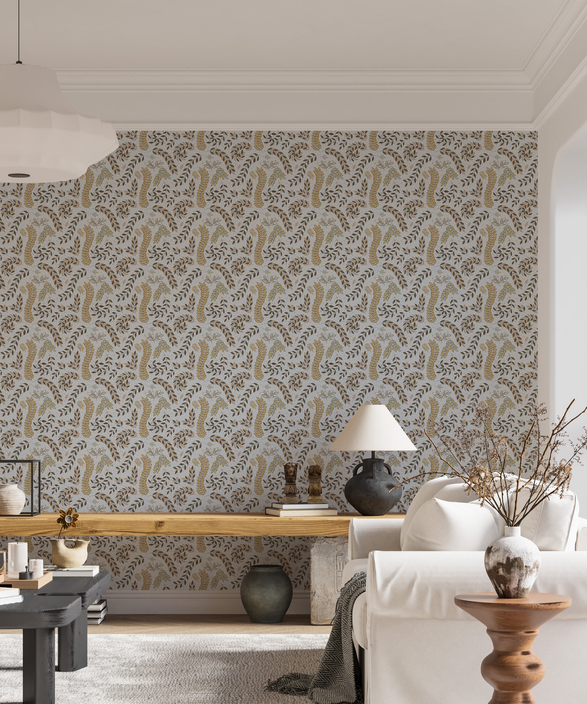 Embrace timeless elegance with our Vintage Foliage Golden and Gray Wallpaper. Featuring hand-drawn leaf motifs in warm golden tones and soft grays, this design creates a delicate yet rich backdrop. Ideal for living rooms, studies, and hallways, it brings nature indoors with a refined vintage twist. The intricate detailing and muted palette make it a versatile option for both classic and contemporary interiors. Peel-and-stick functionality ensures an effortless makeover with no mess or stress.