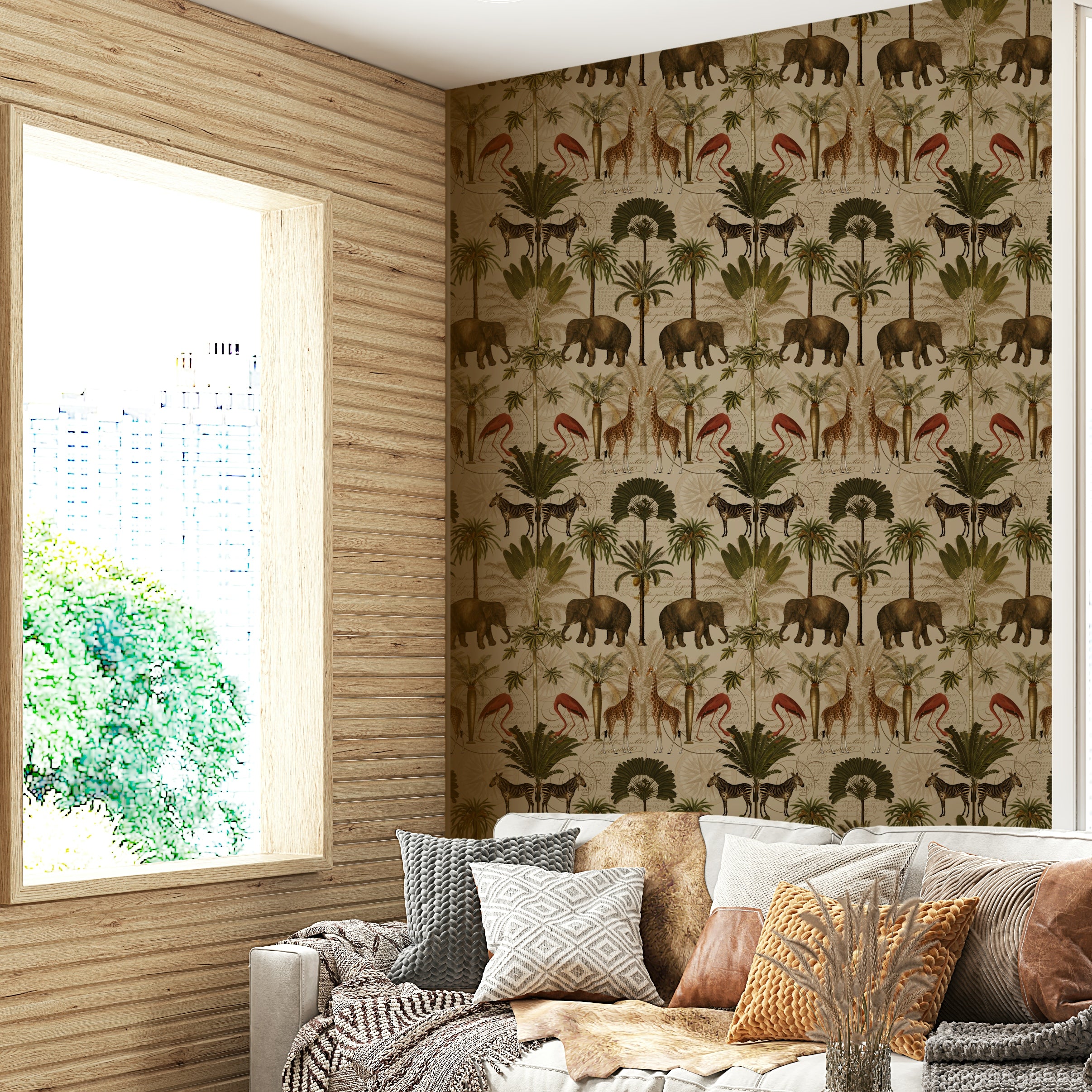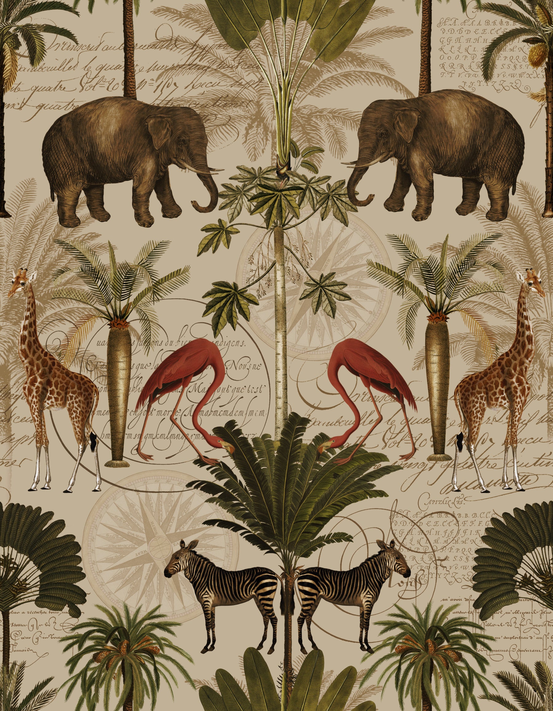 Escape to a bygone era of exotic exploration with this enchanting wallpaper. Detailed illustrations of elephants, giraffes, flamingos and zebras are beautifully interspersed with lush tropical foliage, creating a vibrant jungle scene. The antique-style script and compass accents further enhance the vintage aesthetic, evoking a sense of discovery and wanderlust. Perfect for adding a touch of sophisticated charm and a tranquil, nature-inspired atmosphere to bedrooms, living rooms, or hallways. The rich color palette of greens, browns, and beiges provides a calming and sophisticated backdrop.