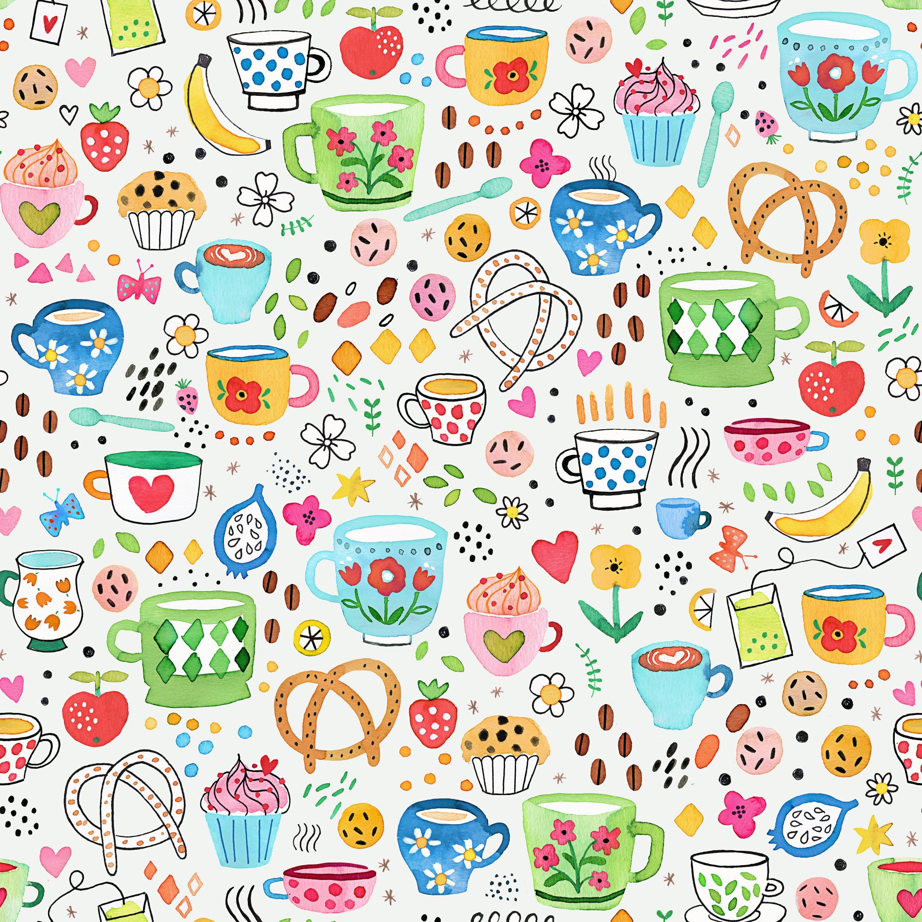 Step into a whimsical world of vintage charm with this delightful wallpaper! A vibrant collection of hand-drawn watercolor mugs, brimming with coffee or tea, share space with charming cupcakes, pretzels, fruit, and flowers. The lighthearted style evokes a cozy, retro-inspired kitchen or a quaint café. Perfect for adding a touch of sweet nostalgia and playful energy to your digital devices, this wallpaper is a cheerful celebration of simple pleasures and delicious treats, capturing the essence of a charming vintage kitchen food restaurant.