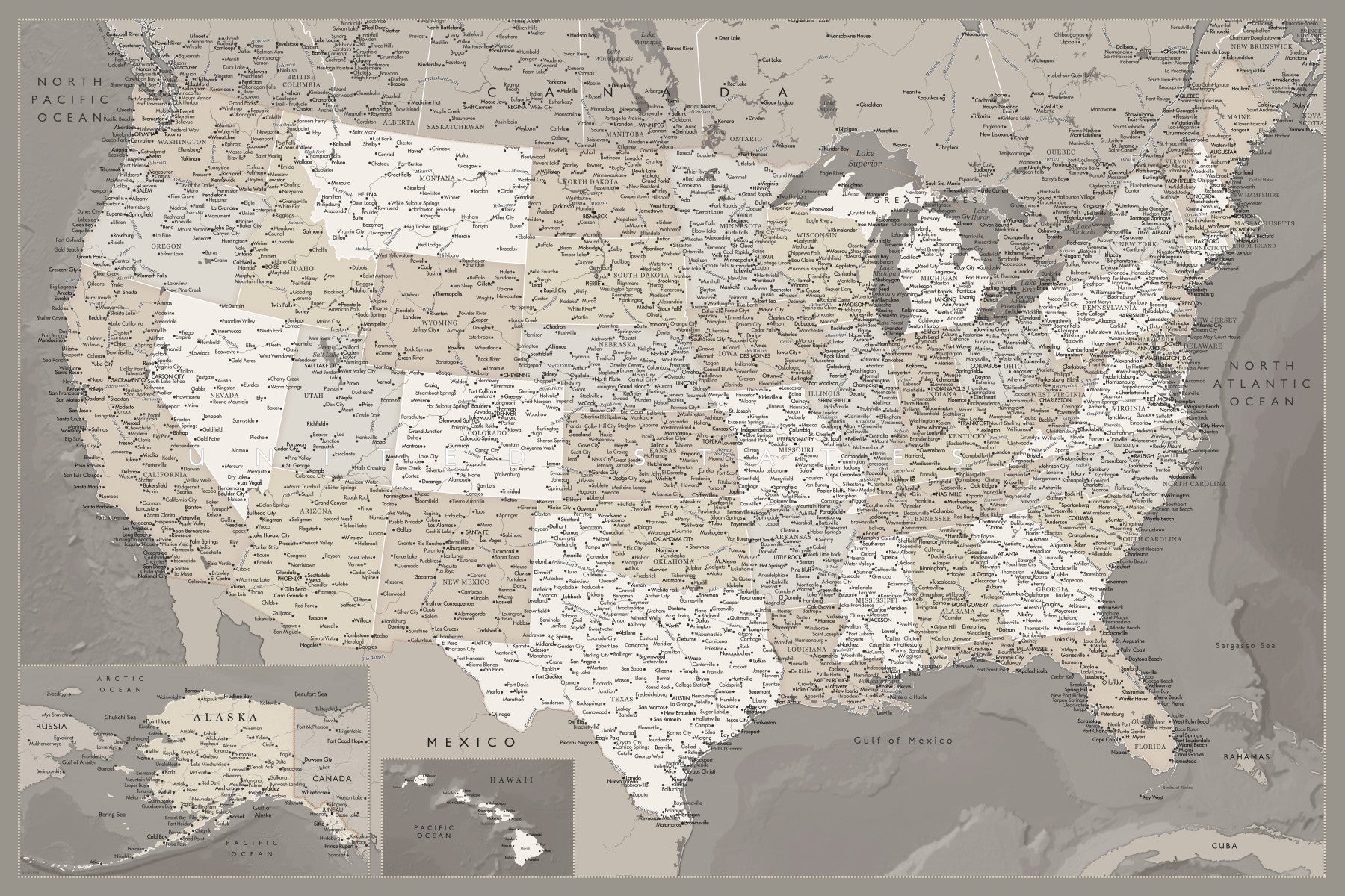 Add timeless cartographic style to your space with the Vintage USA Map Wall Mural. This beautifully detailed design showcases the entire United States with labeled states, cities, and geographic features in a refined vintage map aesthetic. Soft neutral tones of beige, gray, and muted earth colors give the mural a classic, archival look while keeping the information clear and readable. Ideal for offices, study rooms, classrooms, libraries, and travel-inspired interiors, this mural blends education with elegant decor. The intricate typography and map detailing create visual interest across large walls, transforming ordinary spaces into sophisticated geographic displays.