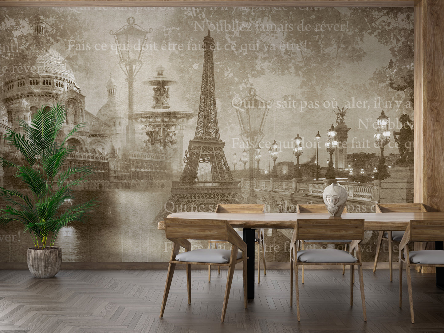 Unveil a realm where the timeless splendor of Parisian landmarks comes to life. This vintage wallpaper for the Paris landmarks collage wall mural showcases a symphony of iconic edifices. From the lofty spire of the Eiffel Tower to the intricate beauty of historical architecture, every inch of this mural sings an ode to the enchanting city of lights. It's not just a mural; it's a journey through the streets of vintage Paris.