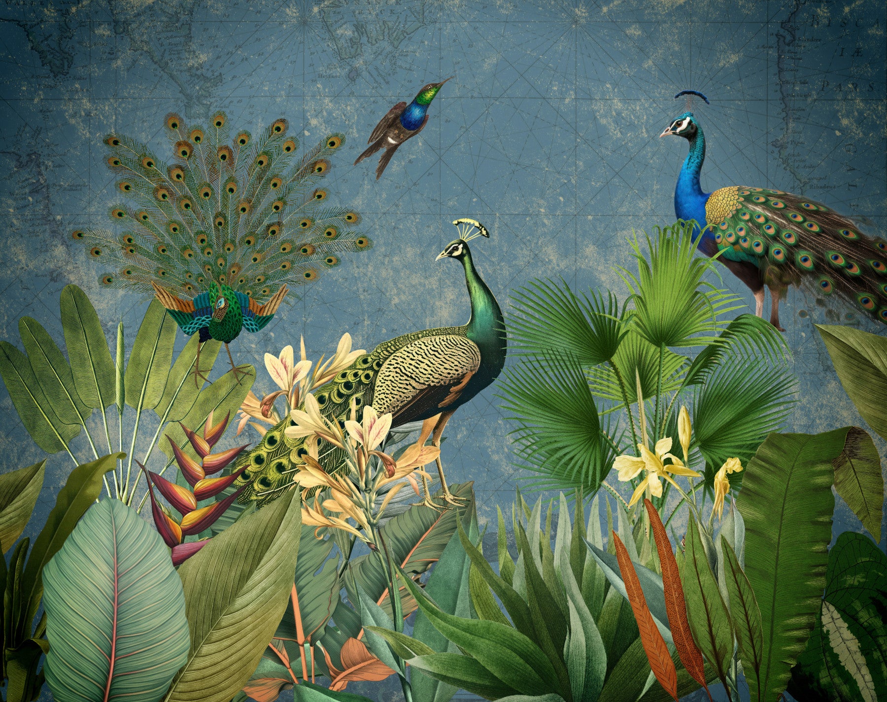 Immerse yourself in a lush, tropical haven with this exquisite wallpaper. Two majestic peacocks, their vibrant plumage a stunning contrast against a muted blue antique map backdrop, take center stage. Surrounded by meticulously detailed botanical illustrations of palm leaves, exotic flowers, and other vibrant foliage, this design evokes a sense of serene beauty and exotic adventure. The hand-drawn style adds a touch of vintage charm, making it perfect for creating a sophisticated and captivating ambiance in any room.
