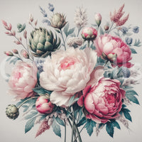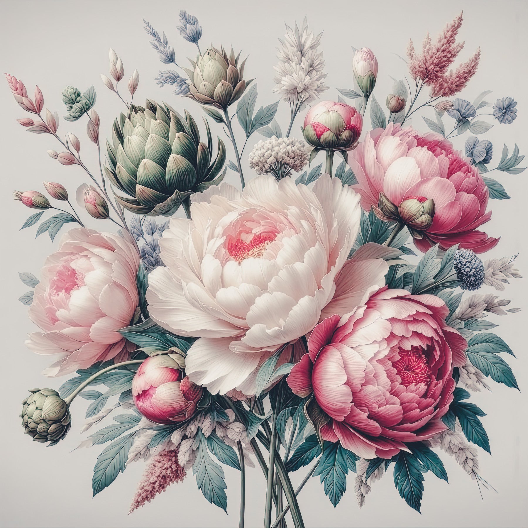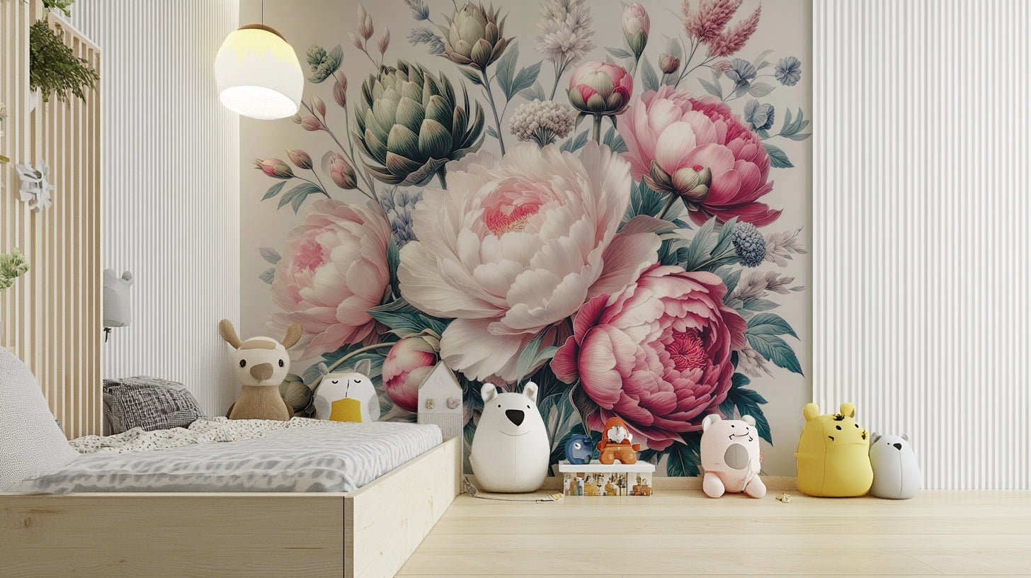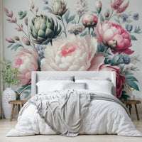 This floral wallpaper for walls features clusters of peony blooms in tones of blush pink and cream. Artichoke flowers and soft blue foliage surround the large peonies, adding botanical interest. This pattern works well in a bedroom or living room to create a peaceful scene. The delicate colors and soft lines make the room feel larger and more inviting. Install this wallpaper to design a space that feels welcoming and fresh.