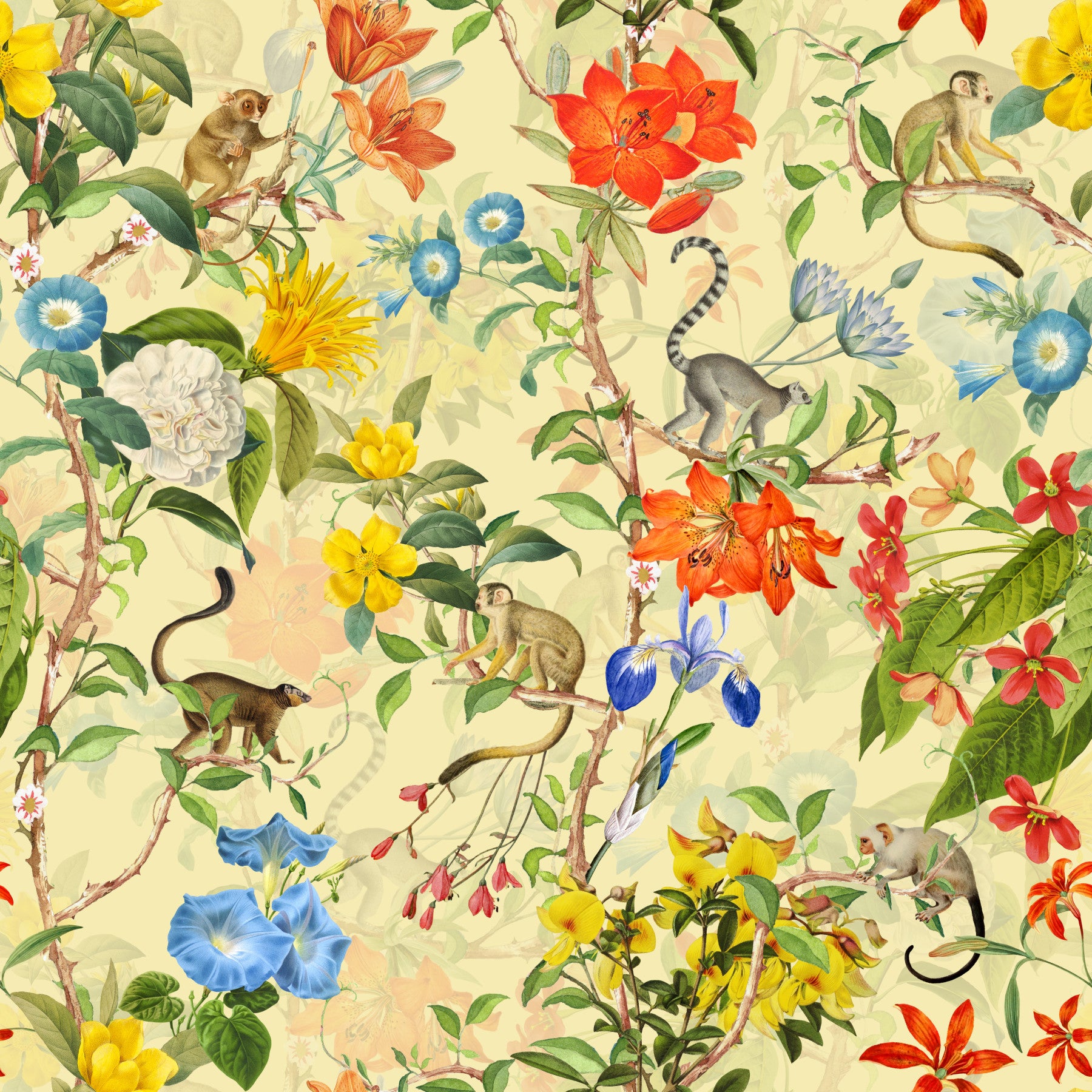 Vintage Primate Paradise design with a mix of bold flora and wildlife.