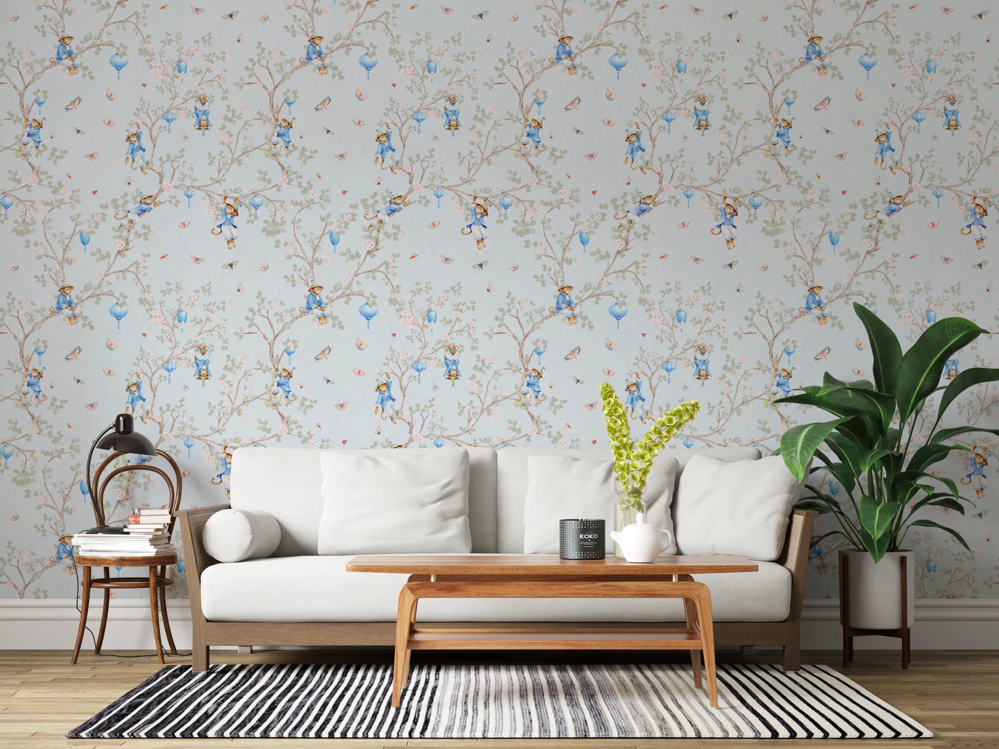 Embrace whimsical elegance with this captivating wall décor by Uta Naumann. The "Vintage Rococo Chinoiserie" design weaves together delicate branches laden with soft pink sakura blossoms and playful monkeys clad in charming blue attire. Traditional Asian lanterns, rendered in a gentle blue hue, dangle gracefully amidst the foliage, adding a touch of serene beauty. Butterfly accents flit across the surface, enriching the design with an air of lightness and movement. This enchanting blend of Eastern and Western influences creates a unique ambiance, infusing your space with a sophisticated charm and a hint of lighthearted fun. Perfect for creating a serene and stylish statement.