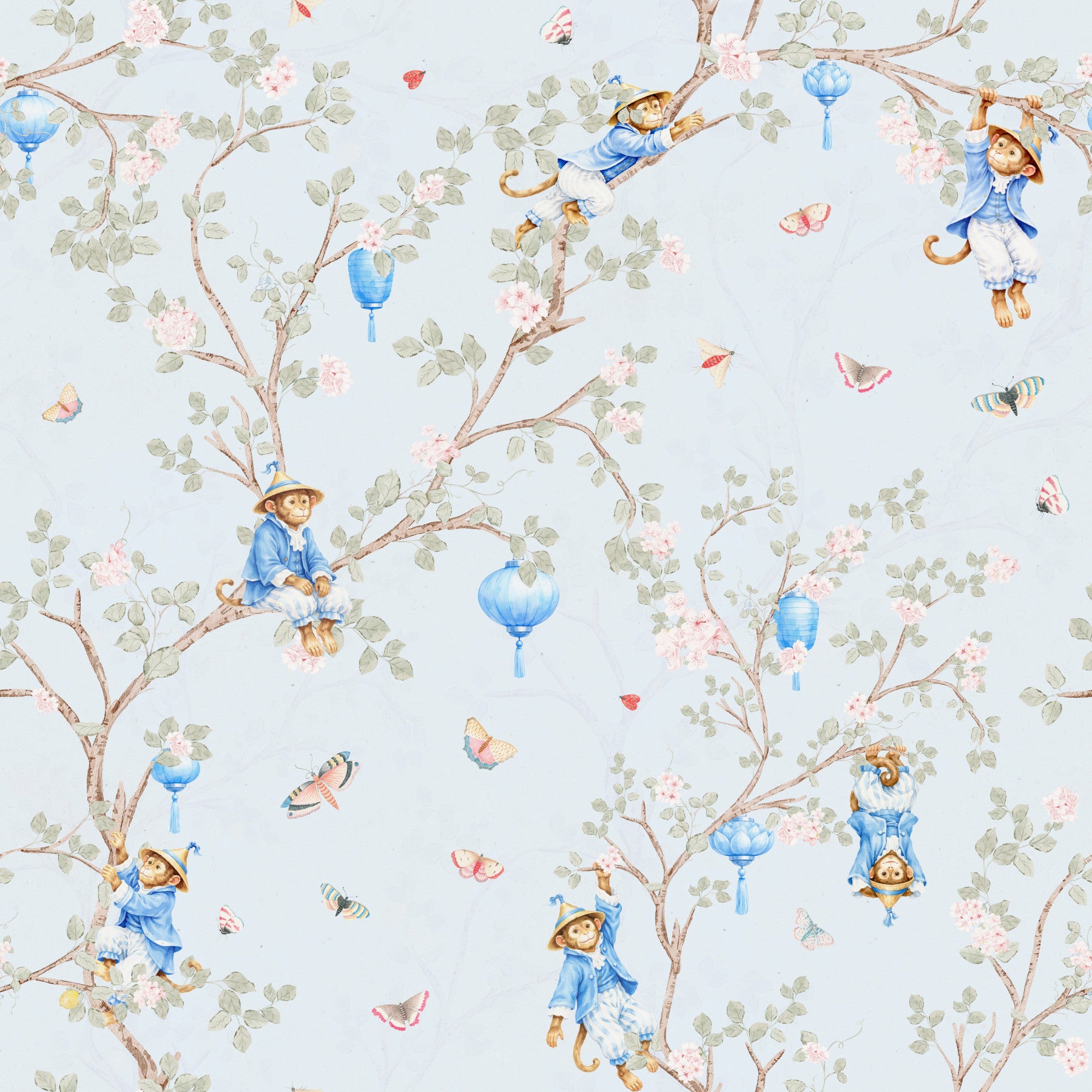 Vintage Rococo Chinoiserie Asian Lanterns with Monkeys and Sakura Flowers blue Wallpaper⁠