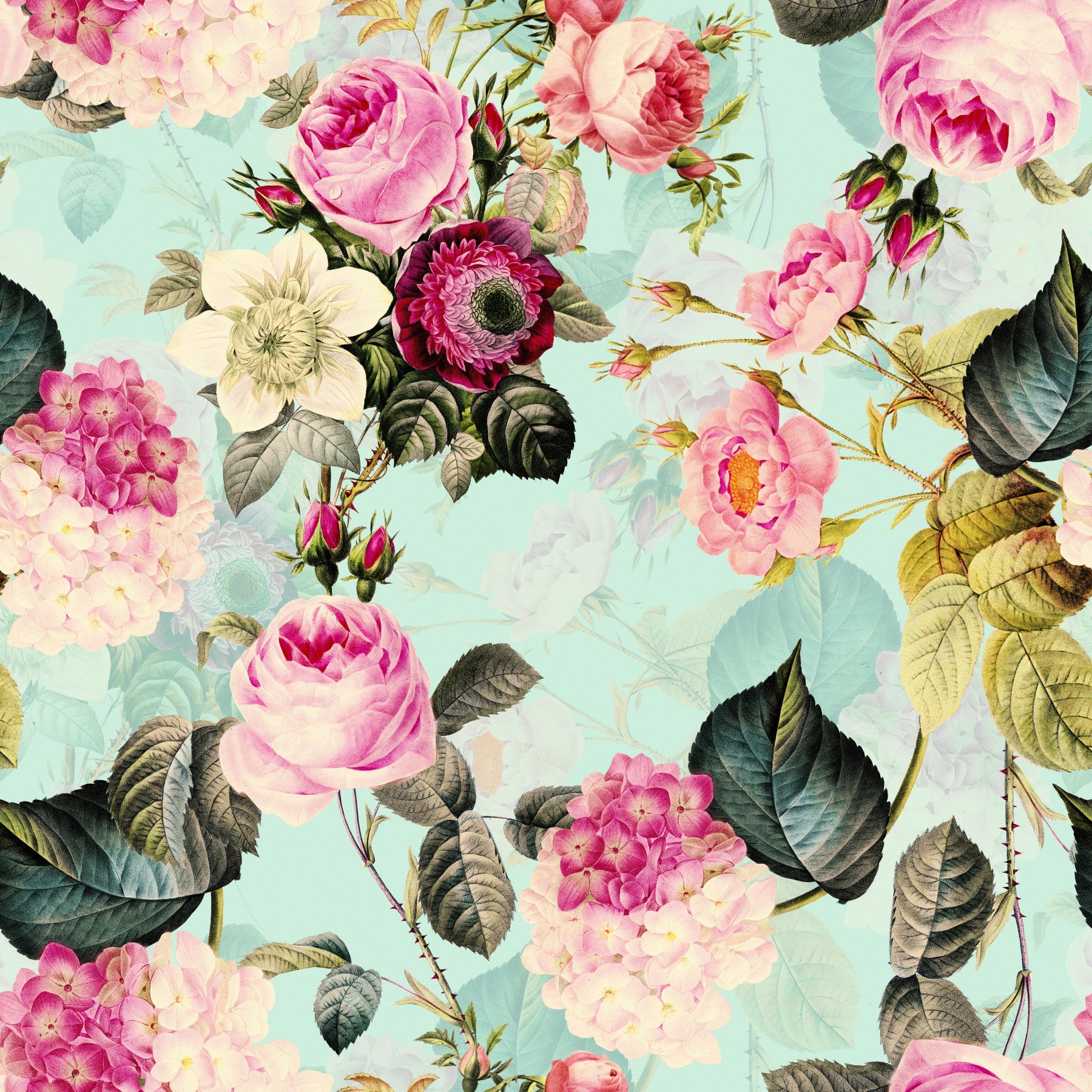 Immerse yourself in the captivating beauty of 'Vintage Rose Garden Rhapsody,' a wallpaper that celebrates the timeless allure of blooming roses. This design showcases a vibrant collection of meticulously rendered roses in varying shades of pink and white, complemented by the rich textures of their leaves and buds. Set against a soft mint green background, the floral arrangement exudes a sense of classic romance and old-world charm. The intricate details and watercolor-like effect create a captivating visual experience, transforming any room into a serene and enchanting haven.