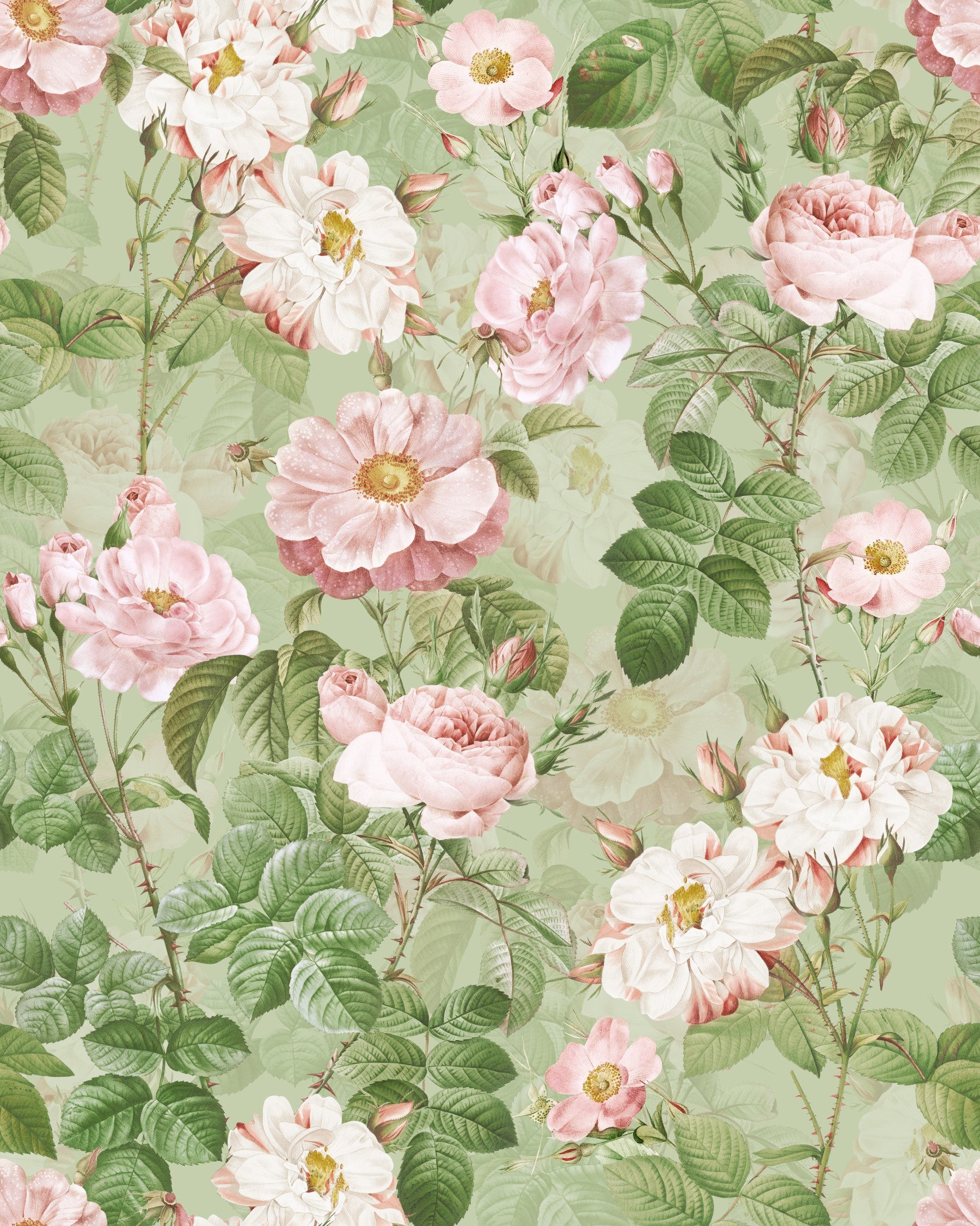This wallpaper captures the timeless elegance of vintage botanical illustrations. Delicate pink and white roses intertwine amidst lush green foliage, creating a romantic and nostalgic atmosphere. The detailed watercolor-like rendering gives each flower a lifelike quality, while the soft color palette brings a sense of calm and sophistication. Ideal for adding a touch of old-world charm to any space, this wallpaper is perfect for creating a serene and inviting ambiance in bedrooms, living rooms, or hallways.