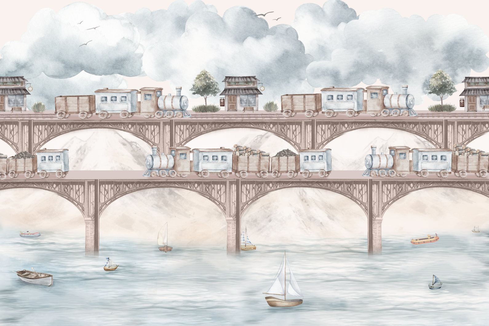 The vintage steam train kids wallpaper brings a nostalgic railway adventure to any child's room. Detailed watercolor steam trains travel across towering bridges, passing old-fashioned stations with a backdrop of misty mountains and flowing rivers. Soft, muted tones create a timeless look, perfect for a classic railway wallpaper theme. Boats sail beneath the intricate bridges, adding a touch of exploration and travel. This transportation kids wallpaper is ideal for young train enthusiasts who love vintage locomotives—the hand-drawn elements charm walls, blending adventure with history in a nostalgic railway mural designed for storytelling.