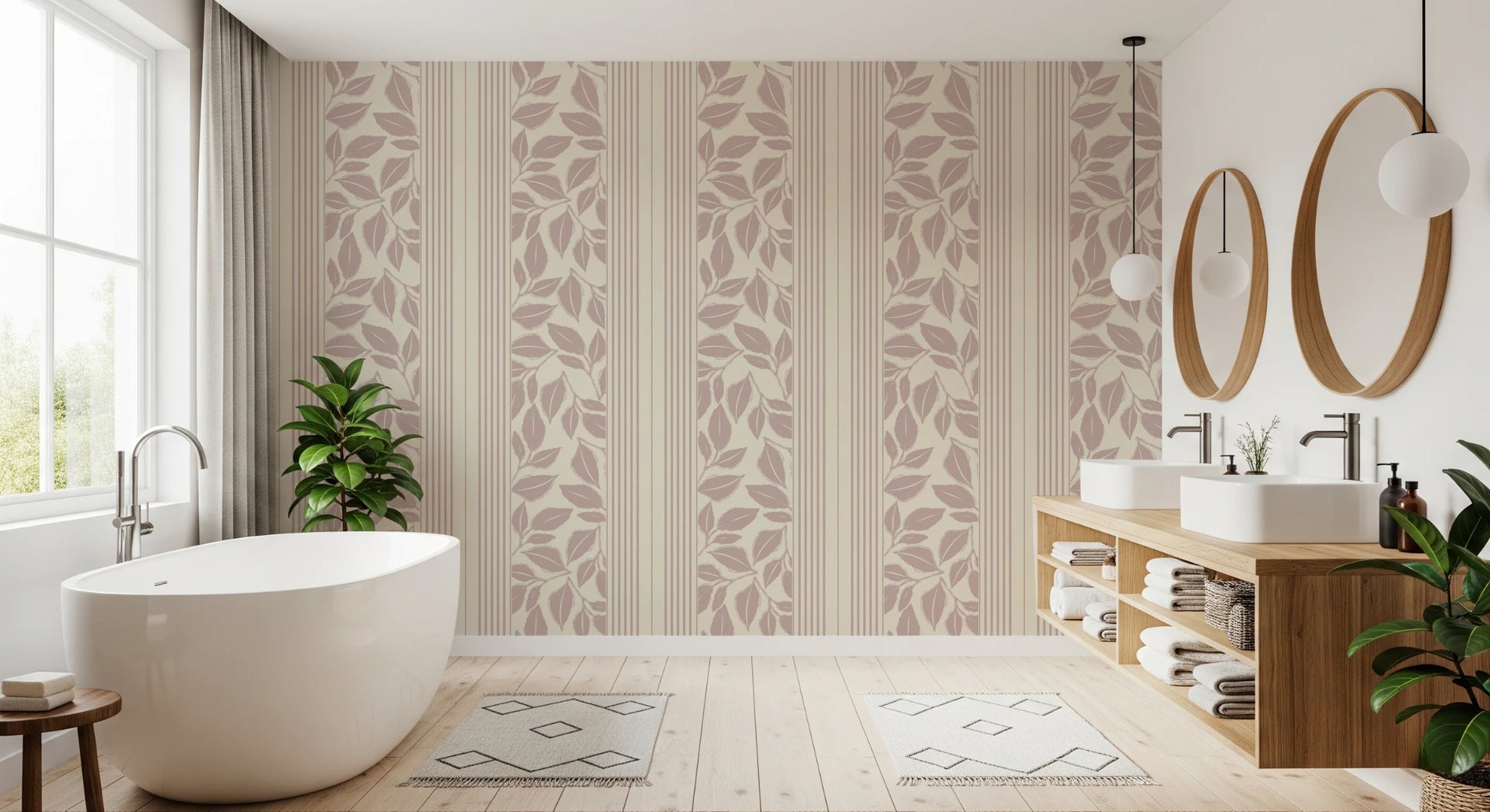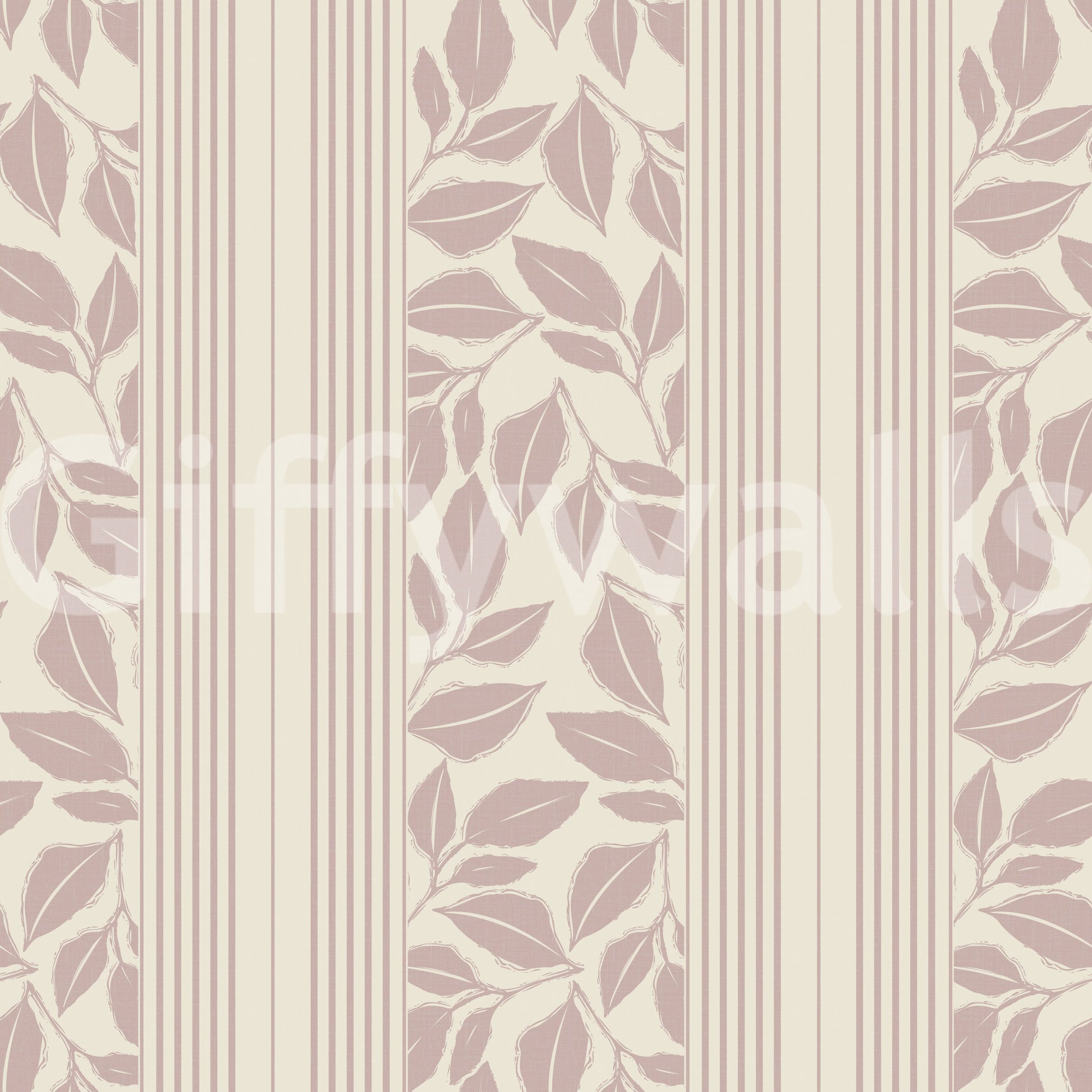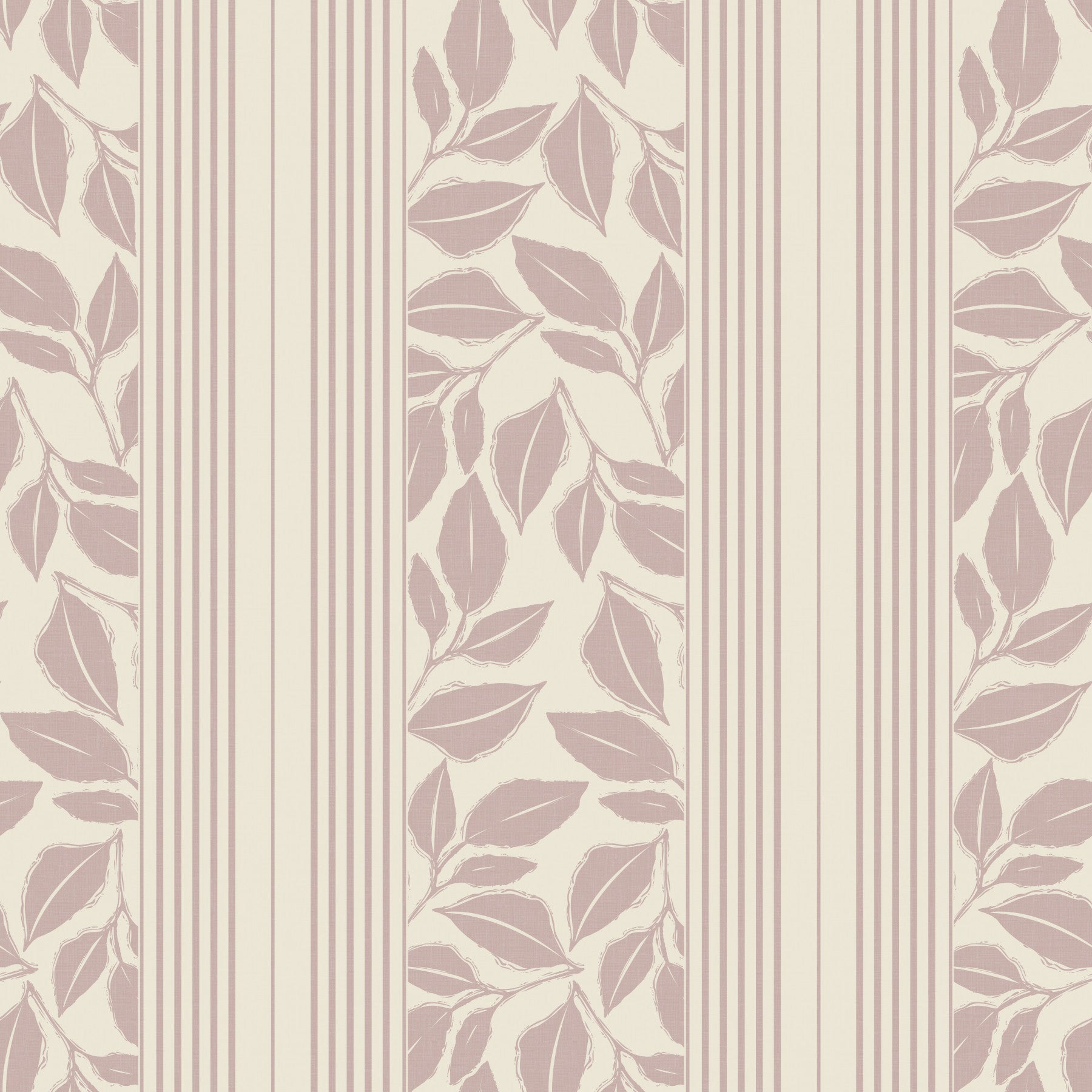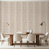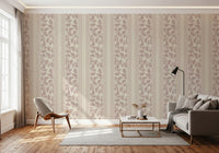 Evoke the charm of yesteryear with the 'Vintage Trailing Foliage Mauve' wall covering. This elegant design presents a delicate dance of mauve-toned foliage, cascading with a gentle grace that whispers of romantic gardens and bygone eras. Subtle vertical stripes in coordinating hues frame the leafy motif, adding structure and a touch of tailored sophistication. The soft, muted palette exudes a sense of tranquility and understated luxury, making it a perfect backdrop for creating a serene and inviting space. This design adds vintage character and a timeless appeal to any room, lending itself well to both classic and contemporary interior styles, bringing a touch of the outdoors in.