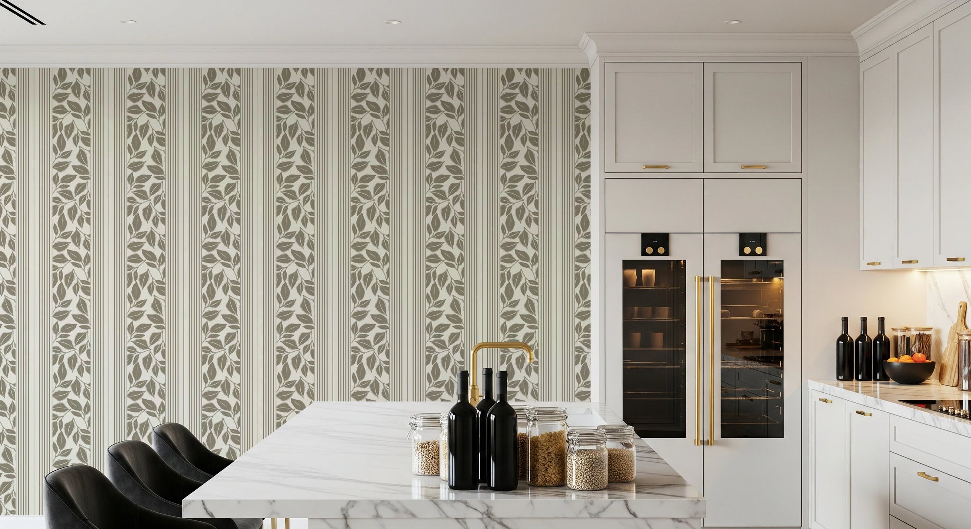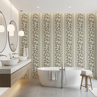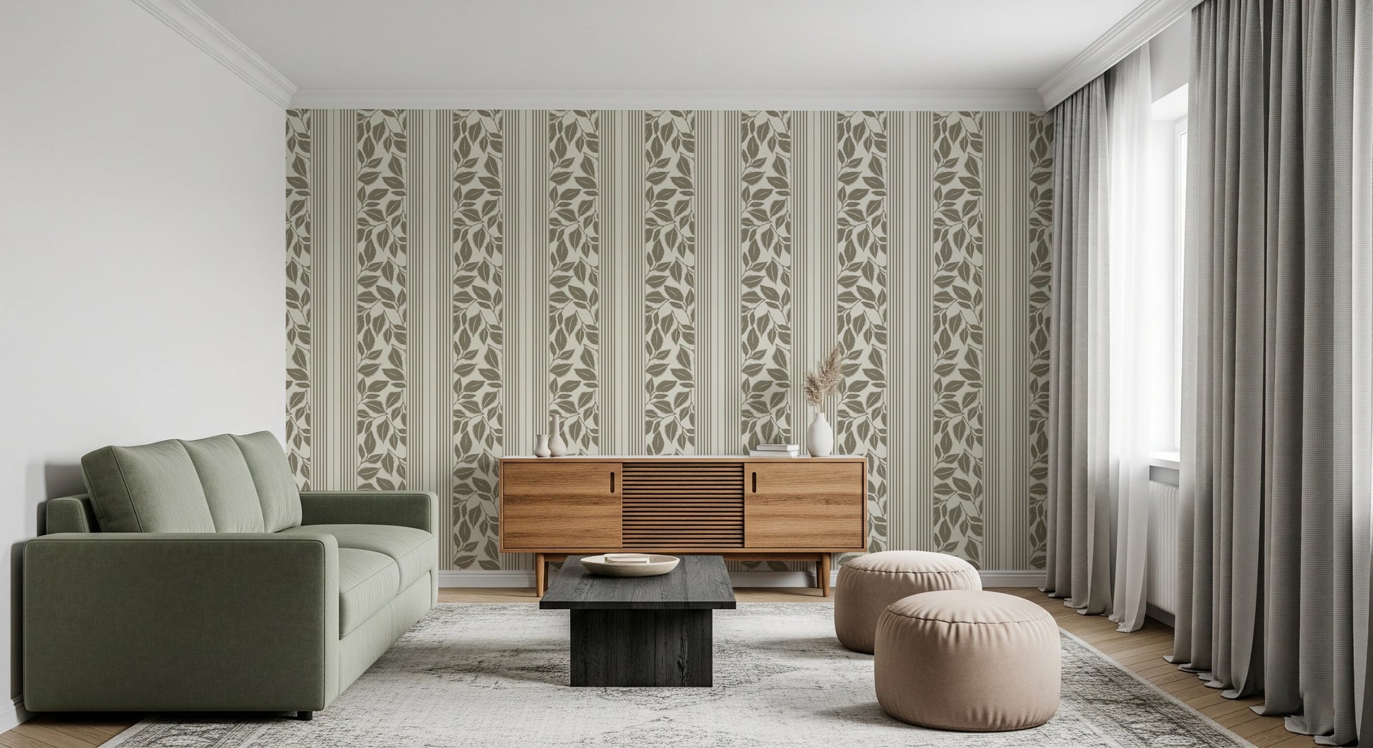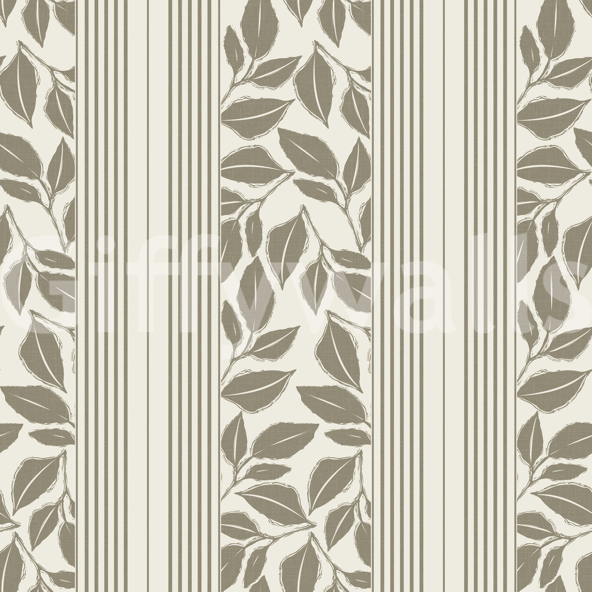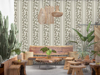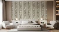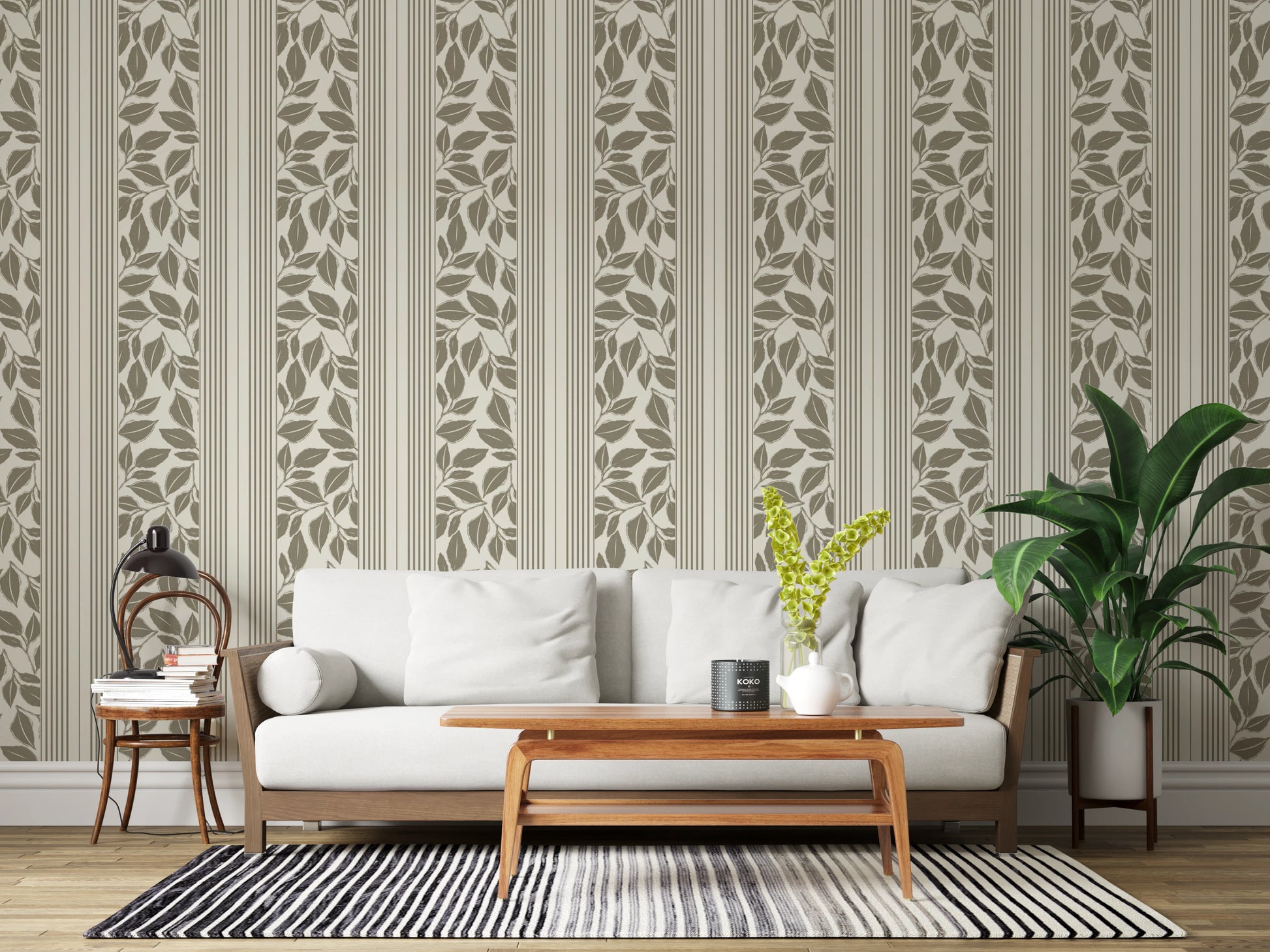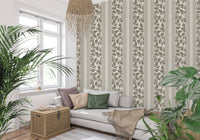 Immerse your space in the serene elegance of the "Vintage Trailing Foliage Olive Green". This design features beautifully illustrated, trailing foliage in a muted olive green hue, evoking a sense of timeless charm and natural grace. The leaves, artistically rendered with a touch of vintage flair, meander across a subtly textured background, creating depth and visual interest. Vertical stripes add further structure and provide a tailored feel. Perfect for creating a calming and sophisticated atmosphere, this wall covering transforms any room into a haven of tranquility and style, perfect for adding a touch of understated refinement to your home.
