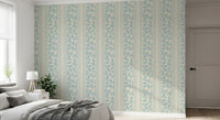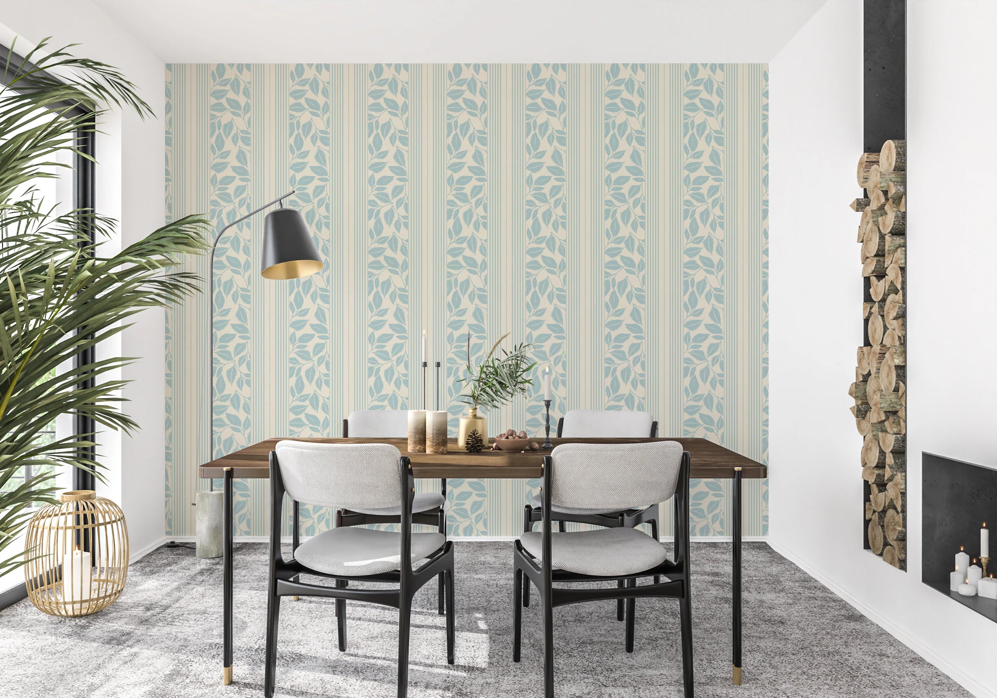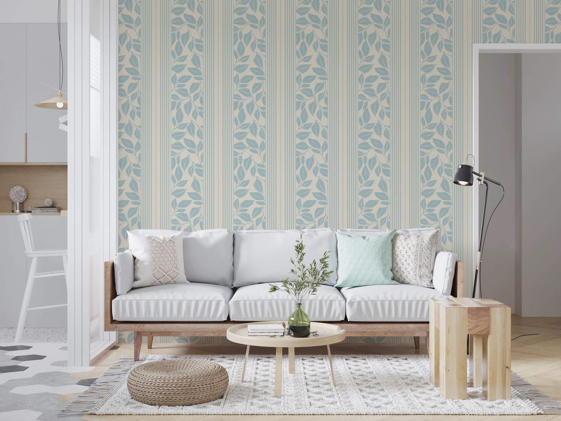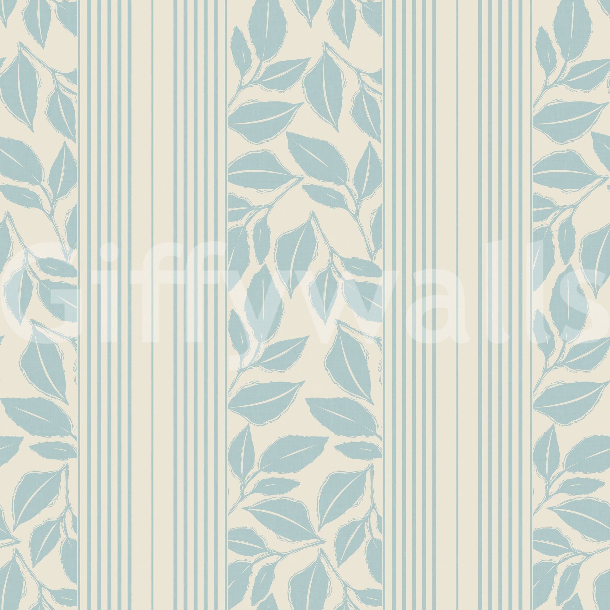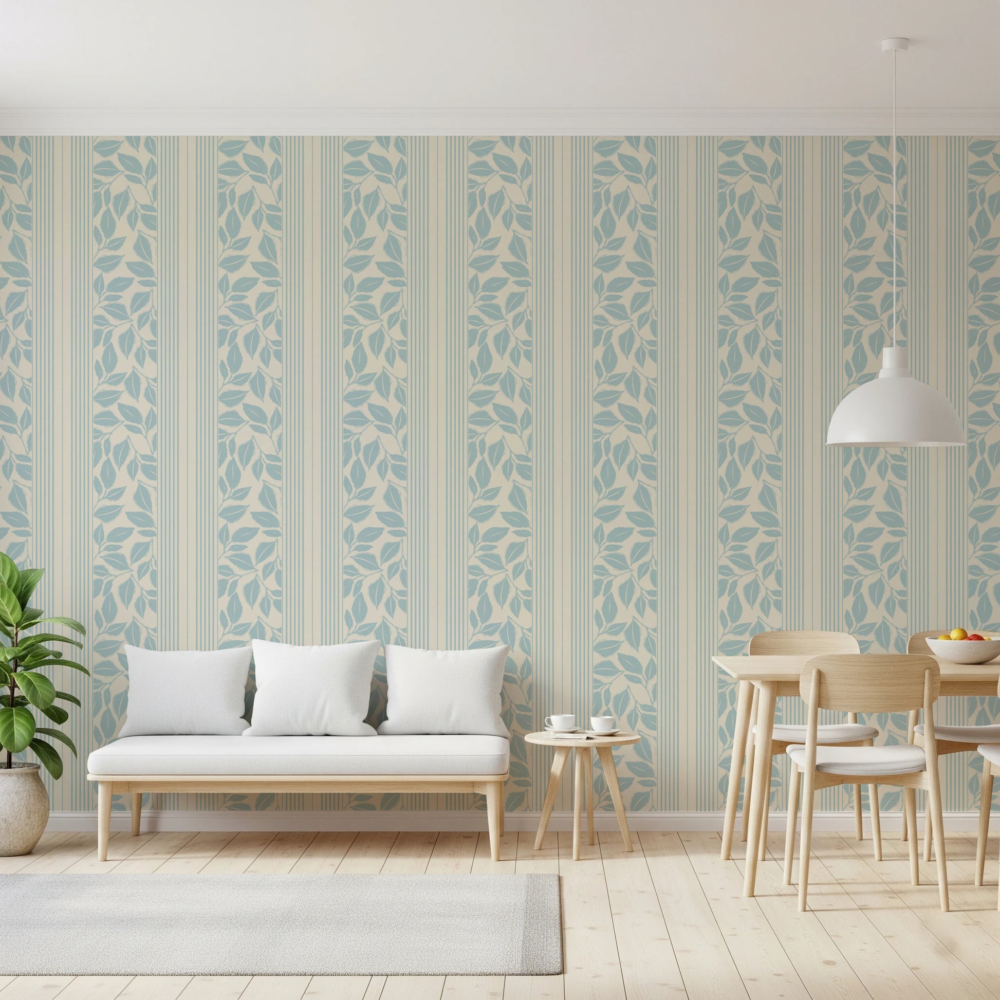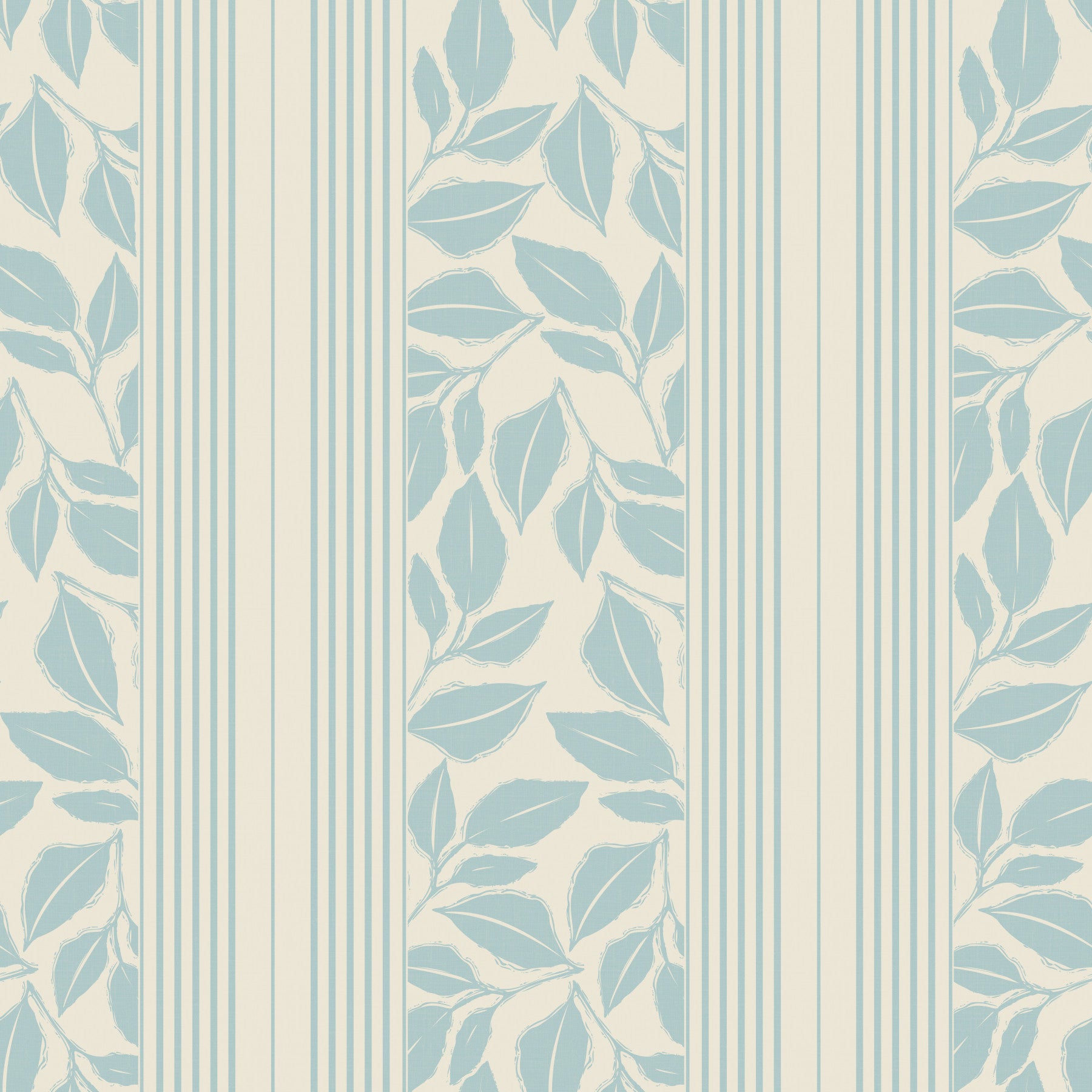 Evoke a serene and timeless atmosphere with this 'Vintage Trailing Foliage Powder Blue' wall covering. The delicate powder blue foliage gently cascades across a subtly textured backdrop, creating a soothing and elegant aesthetic. Bands of matching powder blue stripes add a touch of order and refined sophistication, offering a beautiful contrast to the organic flow of the leaf design. This wall décor adds a touch of vintage charm to any room, creating a calm and stylish space. Its subtle colour palette is perfect for creating a relaxing sanctuary within your home.