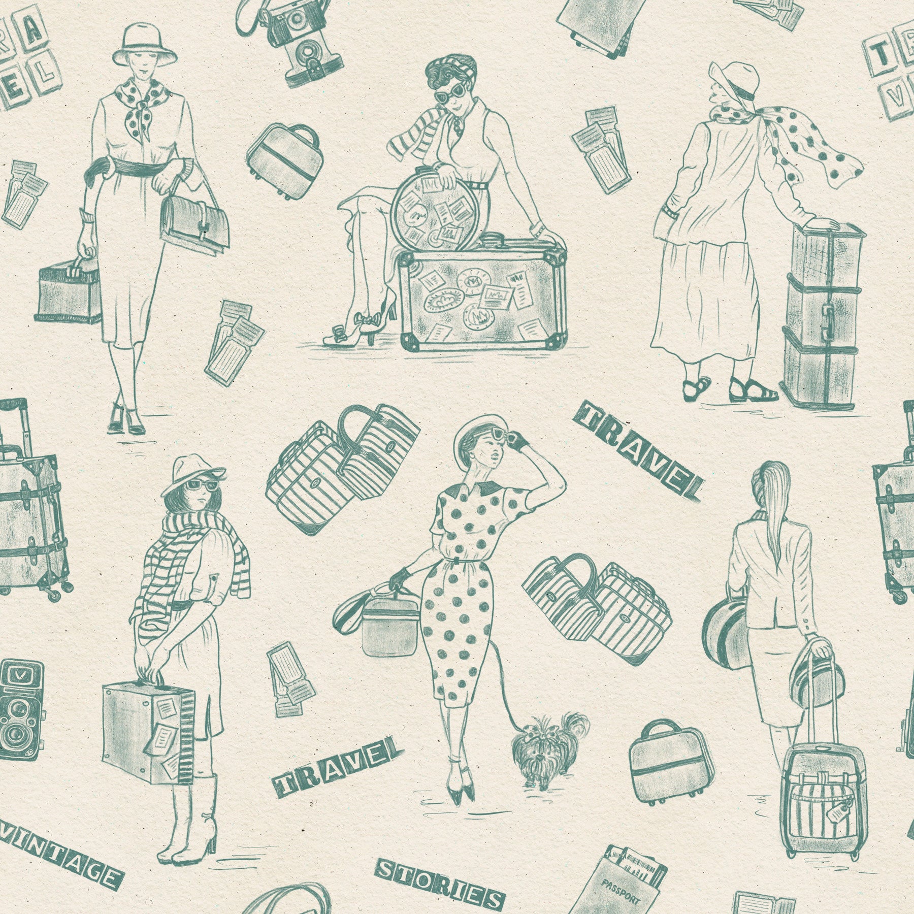 Step back in time with this delightful vintage travel-themed wallpaper for walls. The design features hand-drawn illustrations of stylish travellers, luggage, and vintage cameras, evoking a sense of wanderlust and classic elegance. The neutral background with teal accents creates a sophisticated and calm feel. Use this wallpaper in your living room, bedroom, or home office to bring a touch of retro charm and inspire your next adventure. It especially complements interiors with a classic or bohemian decor.