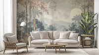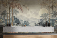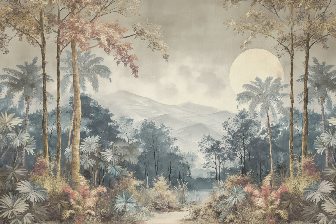 Escape to a serene paradise with the vintage tropical jungle landscape mural. This breathtaking design showcases hand-painted palm trees, lush foliage, and distant mountains bathed in soft, muted tones. Inspired by antique botanical illustrations, this vintage botanical wallpaper adds character to any room. The tropical forest vintage illustration creates a timeless aesthetic, blending nature's beauty with classic elegance. The intricate details of retro jungle landscape wallpaper bring depth and warmth, making walls a focal point. Crafted for a refined touch, this chinoiserie tropical wallpaper enhances interiors with sophistication. Experience the charm of nature indoors with this captivating jungle-inspired masterpiece.
