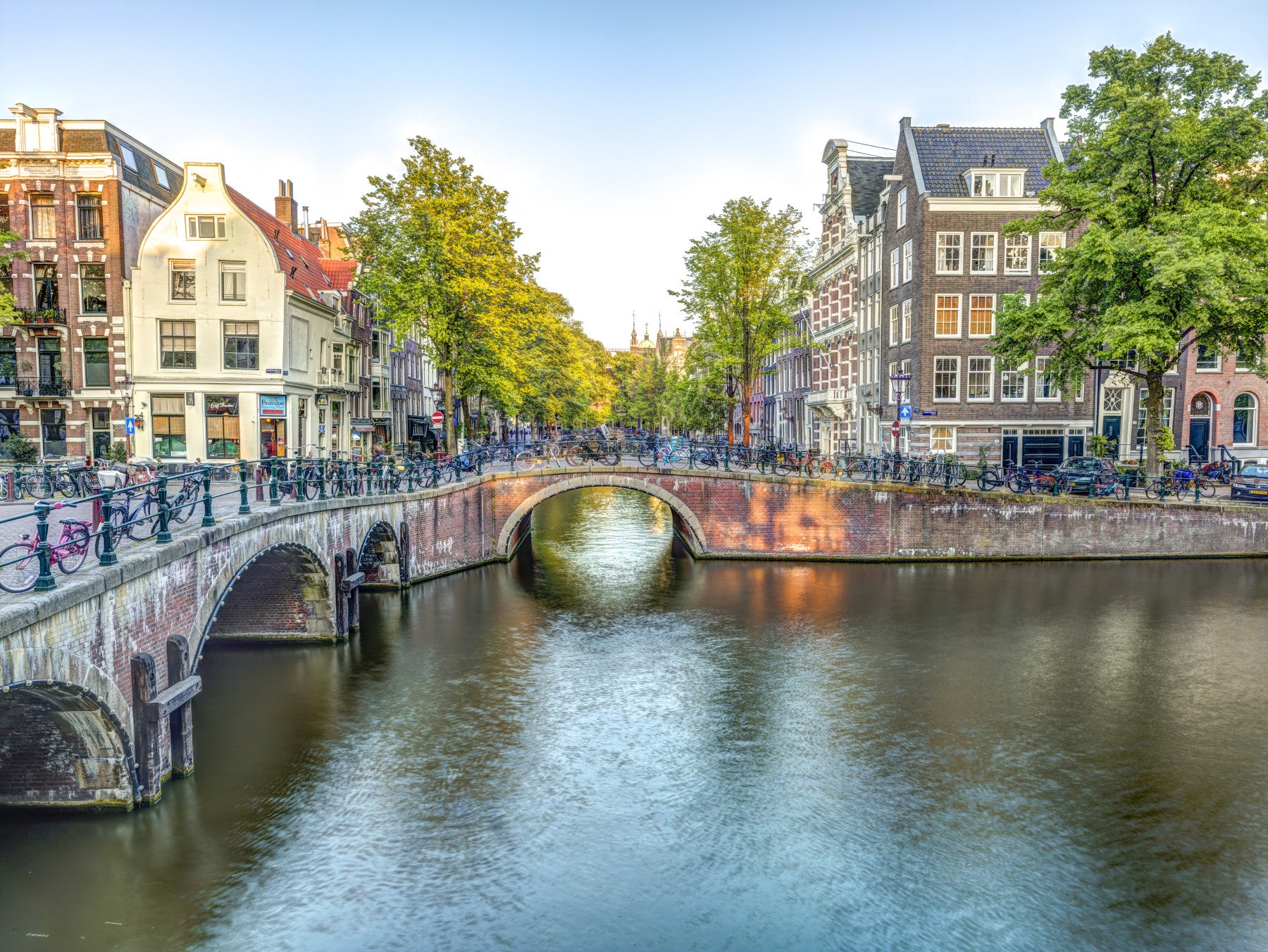 Canal through Amsterdam city. Transform your space with the timeless charm of Amsterdam. This wall décor piece captures the tranquil beauty of a quintessential Amsterdam canal scene. Imagine the serene water reflecting the warm hues of the brick bridges and the iconic Dutch architecture that lines the waterways. Bicycles rest casually along the bridge's edge, hinting at the city's vibrant, eco-conscious culture. Lush green trees create a beautiful frame, adding a touch of nature to this urban landscape. The subtle golden light filtering through the scene evokes a sense of peace and invites you to step into the heart of this captivating city. Infuse your environment with a touch of European elegance and the laid-back atmosphere of Amsterdam's canals with this evocative wall art.