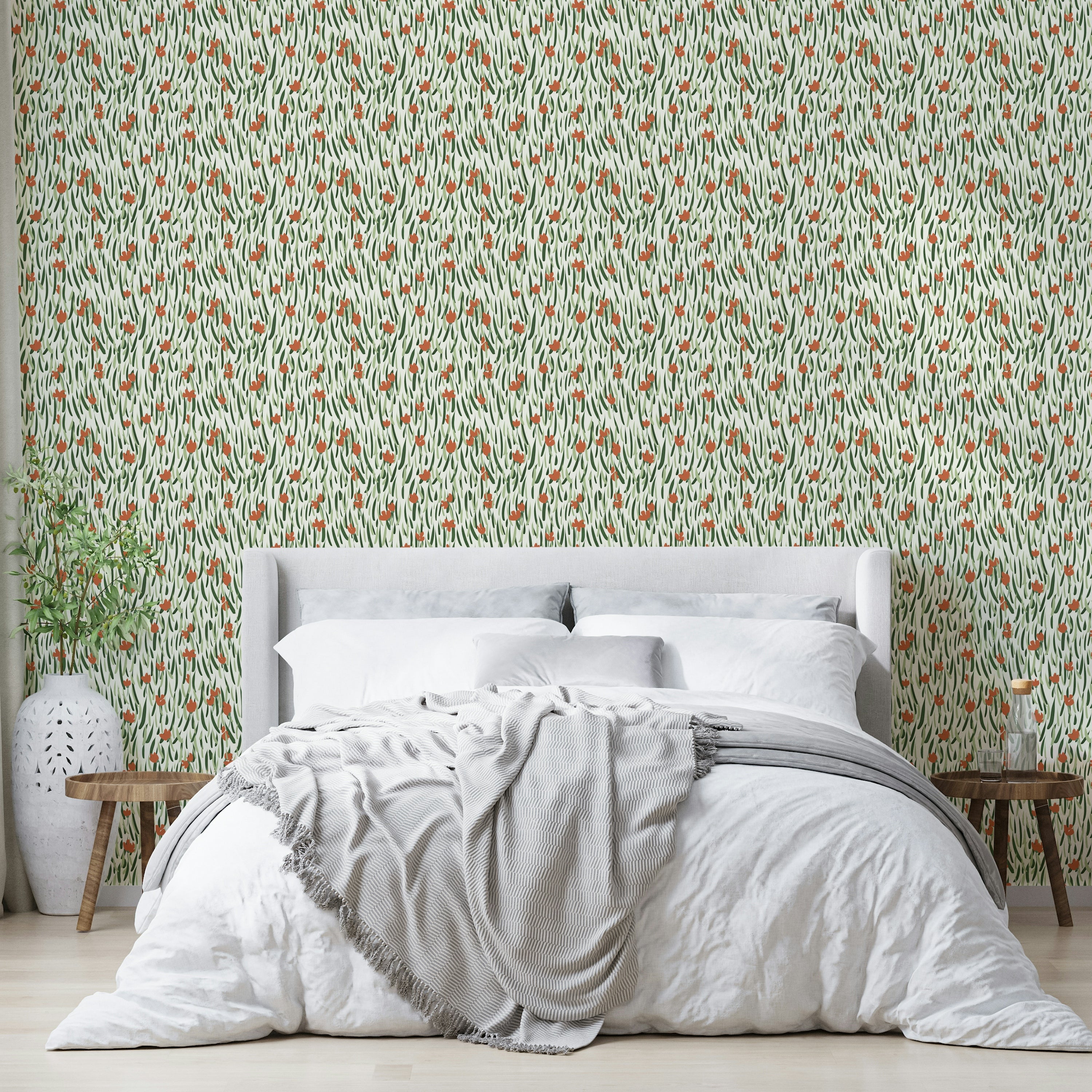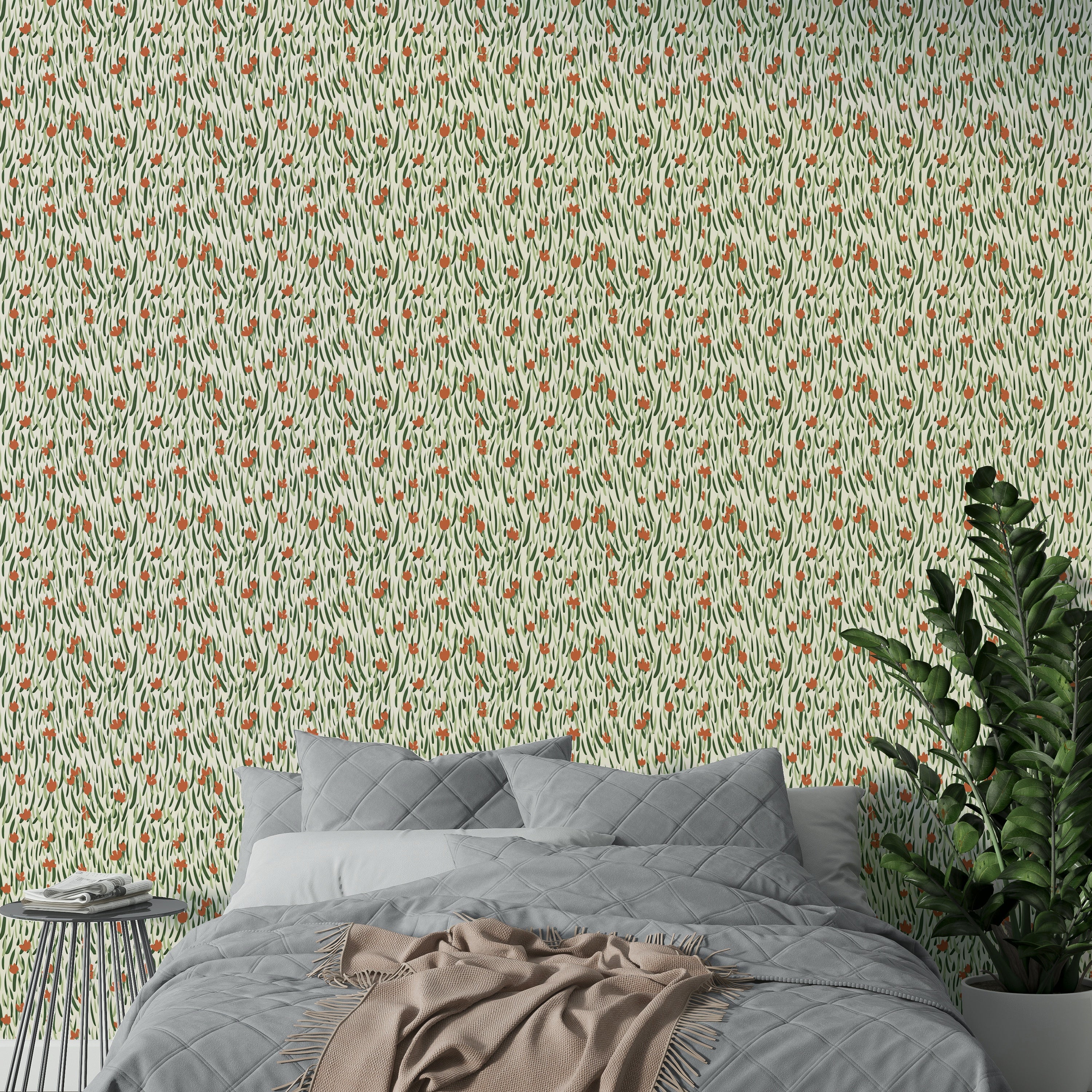 Bring movement and vibrancy to your space with Wandering Blooms wallpaper. This design features loose, painterly strokes of green leaves and scattered red-orange blossoms set against a soft cream background. The flowing arrangement gives a sense of motion, as if the flowers are swaying in the breeze. Ideal for accent walls in living rooms, dining areas, or creative spaces, this wallpaper for walls adds a fresh and modern floral touch. Its abstract, nature-inspired pattern works well with minimalist or artistic interiors, offering a bold yet natural look that’s both playful and elegant.