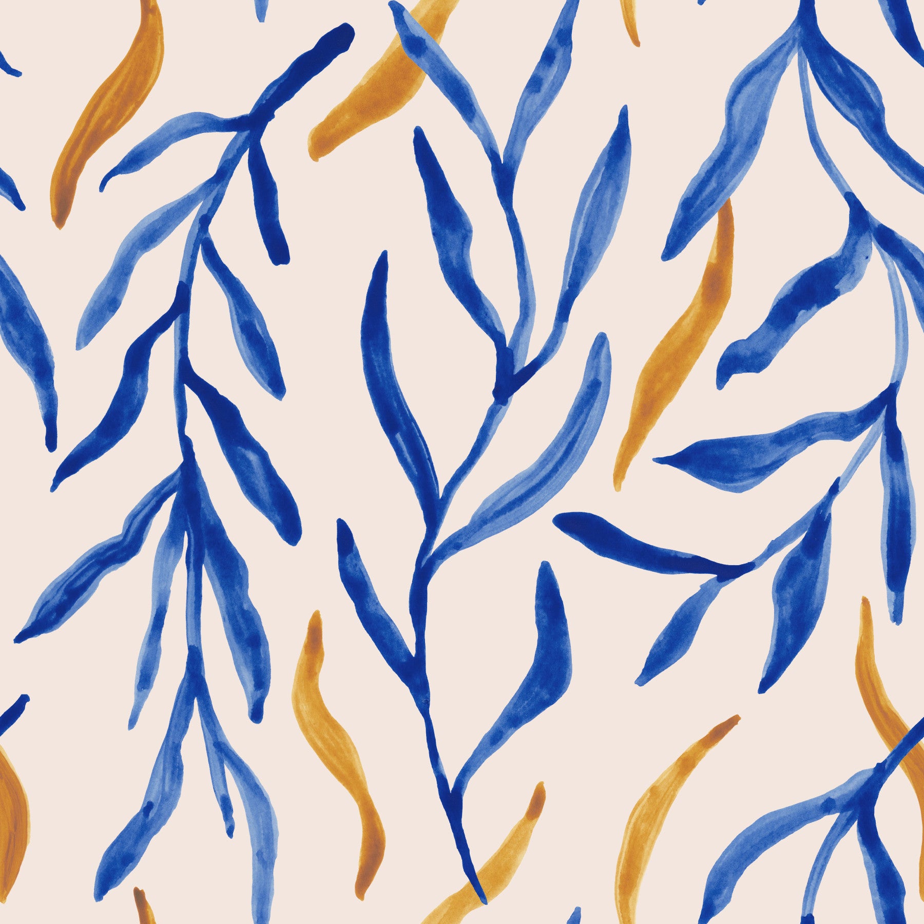 Watercolor botanical pattern with layered blue leaves and gold accents.