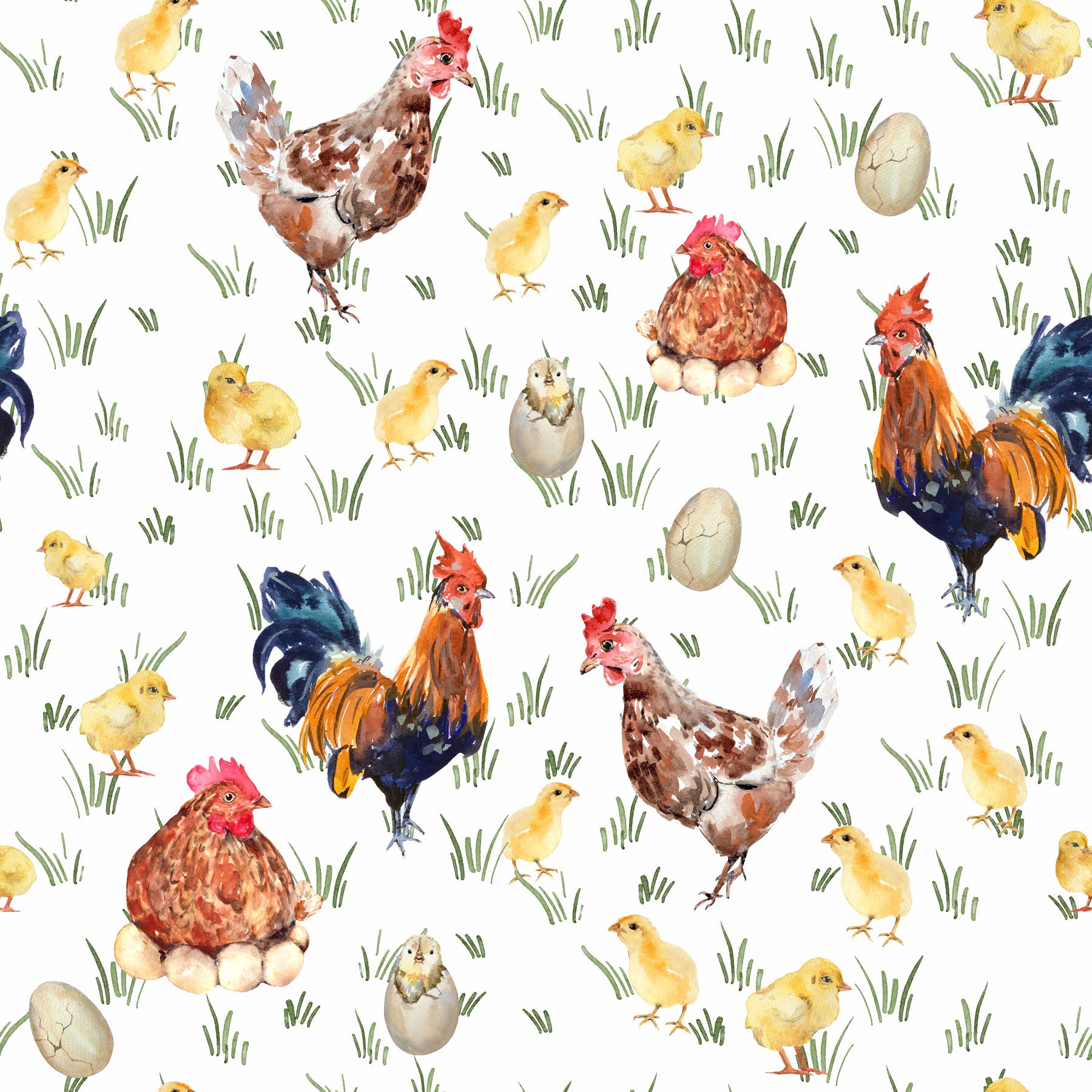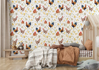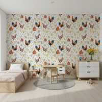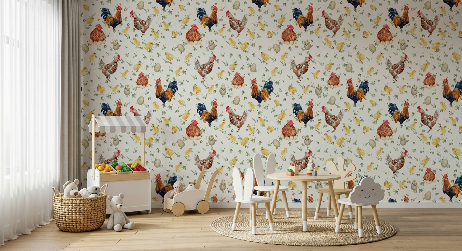 Add a dash of rustic charm with this delightful chicken and chick themed watercolour wallpaper for walls by Uta Naumann. This design showcases playful illustrations of hens, roosters, and fluffy chicks amidst blades of green grass and hatching eggs. The watercolour technique lends a soft, painterly quality, perfect for enlivening a nursery, playroom, or country kitchen. Its inviting design complements interiors inspired by farmhouse living, adding an atmosphere of warmth and joyful simplicity.
