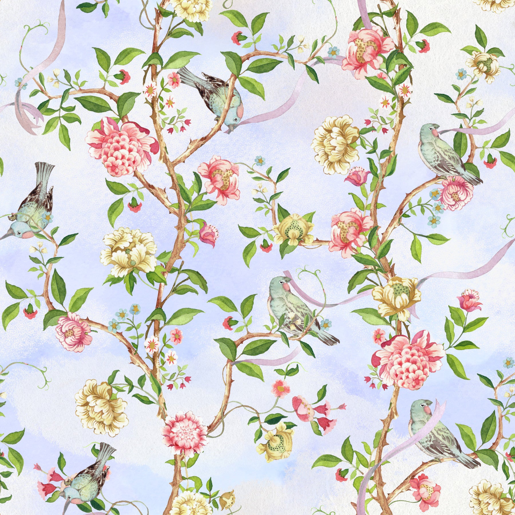 Inspired by classic Chinoiserie designs, this wallpaper features a captivating watercolor painting of flowering branches and delicate birds. The soft pastel palette, featuring shades of pink, yellow, and blue, creates a serene and elegant atmosphere. The intricate details of the flowers and birds, rendered with exceptional skill, add depth and visual interest. This wallpaper is perfect for adding a touch of timeless sophistication to any room in your home, bringing a sense of calm and beauty to your space. The elegant and refined style complements various interior design styles, making it a versatile choice.
