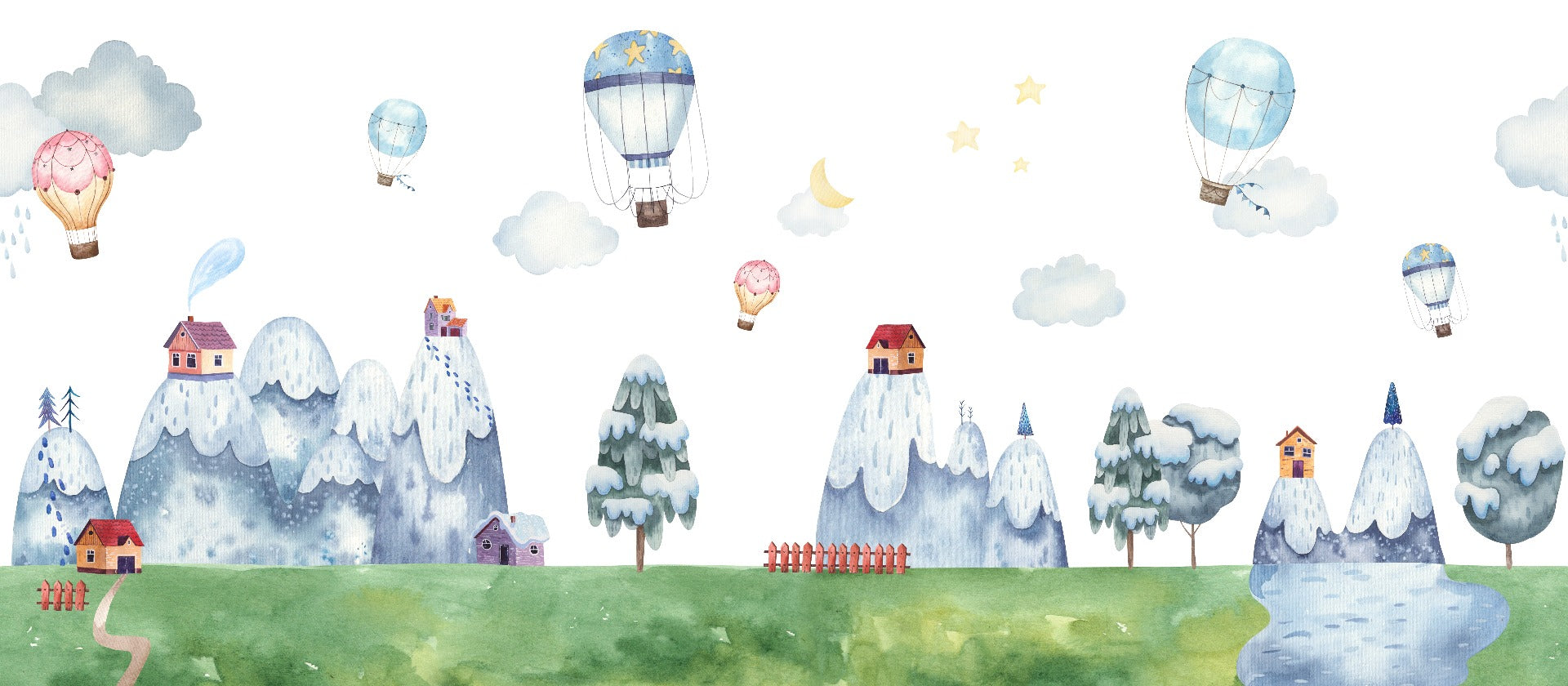 Children's wallpaper with whimsical mountains and homes