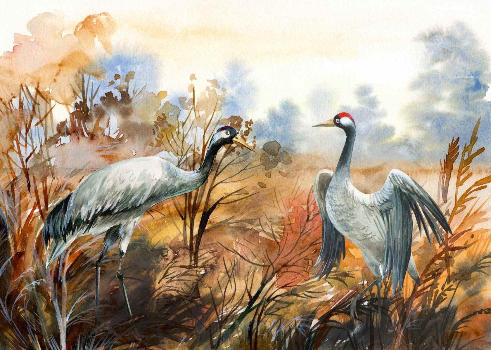 Autumn landscape & crane birds watercolor wallpaper - Giffywalls