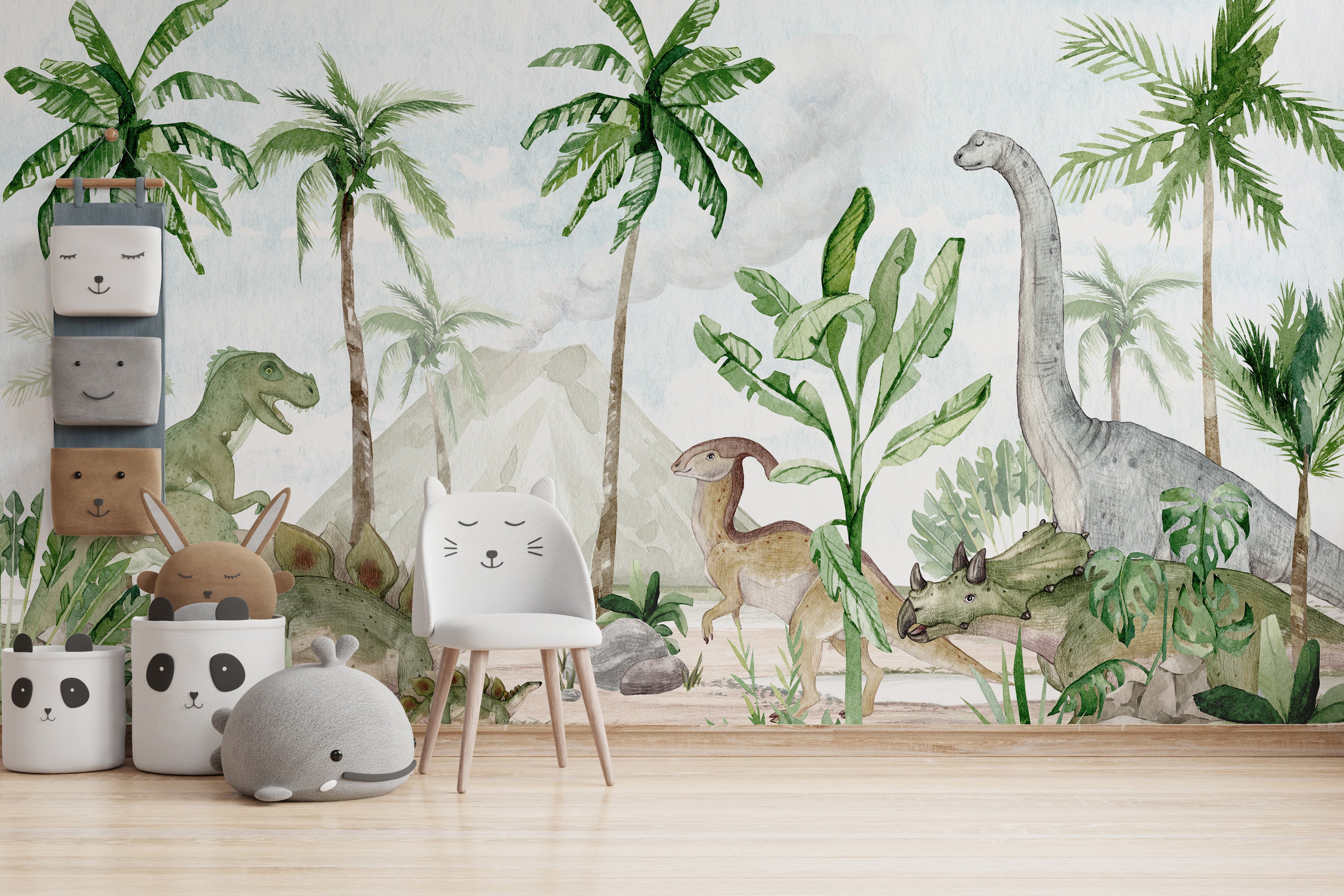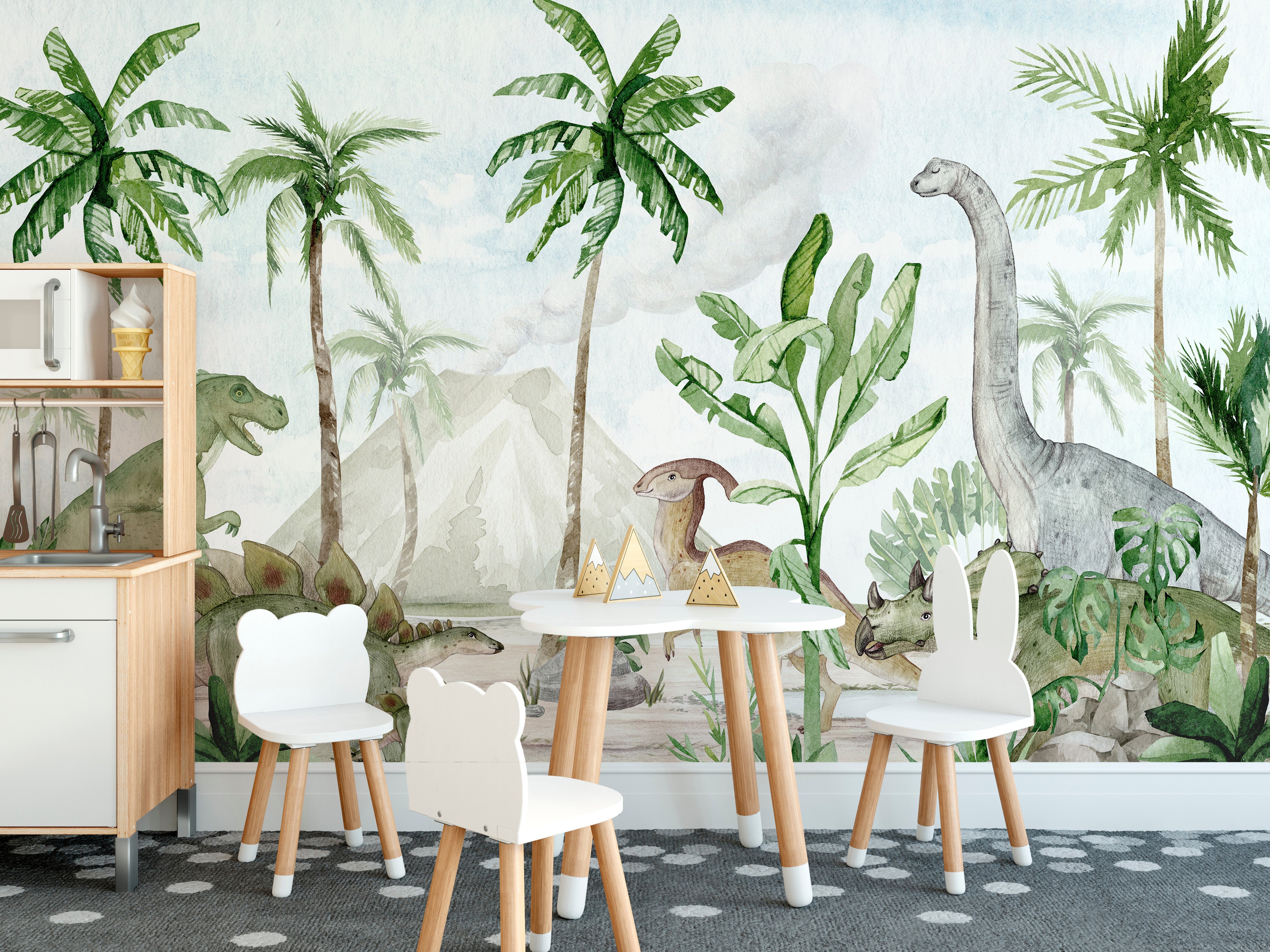 Transform your room into a prehistoric wonderland with our Watercolor Dinosaur Forest Wallpaper. This enchanting design features gentle giants roaming through a softly painted forest, bringing the magic of the Mesozoic era to life. The dreamy watercolors create a whimsical and inviting atmosphere, perfect for sparking imagination and adventure in any child's room. Whether for playtime or bedtime stories, this Dinosaur wallpaper is an ideal backdrop for dinosaur enthusiasts and young explorers alike, inviting them into a world where dinosaurs still roam.