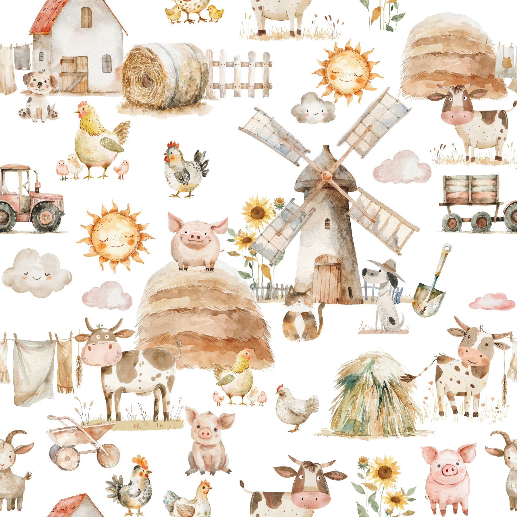 Watercolor Farm Fun print, happy farm animals pattern background.