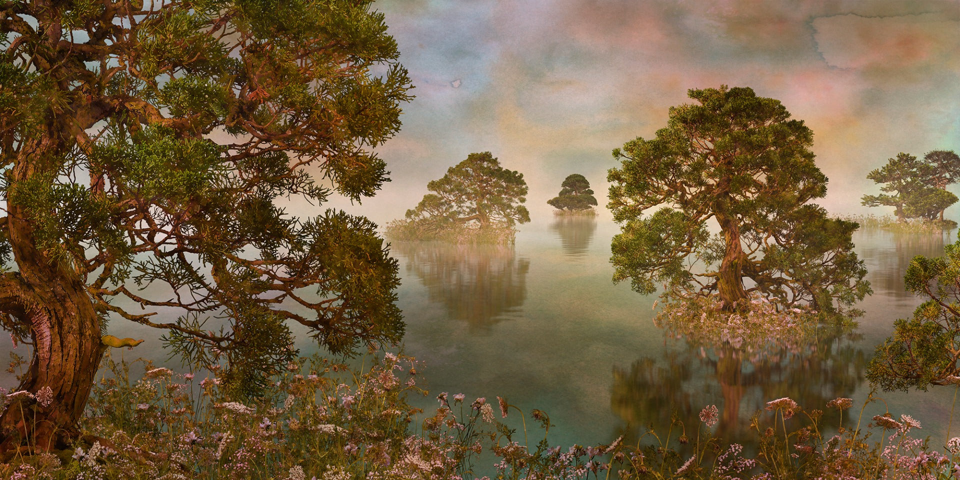 Add beauty and calm with watercolor lake sunset forest mural wallpaper.