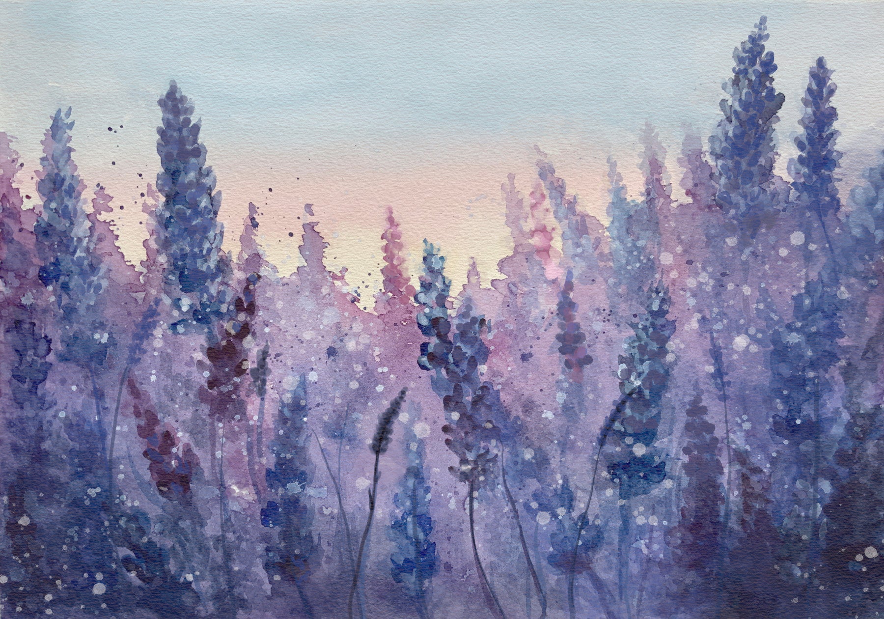 Drift away with this artistic depiction of a lavender field. This artwork features flowing brushstrokes in shades of blue, purple, and a hint of pink, capturing the essence of a peaceful landscape. Use this wallpaper for walls to create a soothing atmosphere in your bedroom, bathroom, or reading nook. The watercolor style works beautifully with cottagecore, farmhouse, or minimalist interiors, adding a soft, romantic touch to any room.