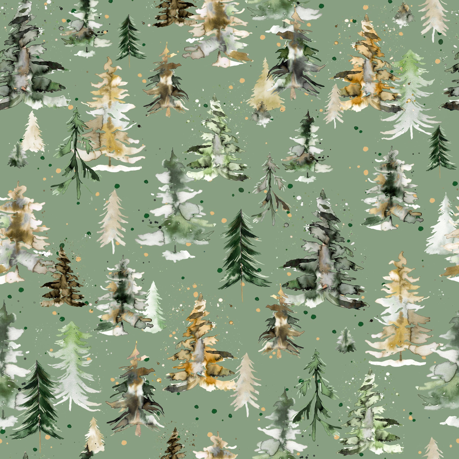 Immerse yourself in the tranquil beauty of a sage green watercolor forest. This wallpaper showcases a serene landscape of pines and spruces, rendered in soft, painterly strokes. Subtle variations in greens, browns, and creams create a sense of depth and realism within the stylized watercolor trees. Delicate splashes of color add a touch of whimsy, reminiscent of falling snow or dappled sunlight. The overall effect is calming and sophisticated, perfect for creating a peaceful atmosphere on your digital devices. Escape to nature with this captivating and uniquely artistic wallpaper design.