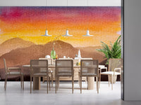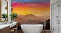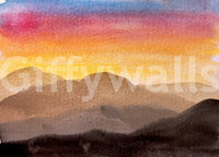 Watercolour Sunset wallpaper brings a calm, dreamy feel with soft, hand-painted washes of colour. A gradient sky shifts from deep blue and violet to warm pink, orange, and golden yellow, fading into layered brown hills along the horizon. The loose watercolour texture and gentle edges make it feel relaxed and artistic, like a small landscape study. This wall mural suits living rooms, bedrooms, nurseries, and creative studios, adding warmth to modern, boho, or minimalist interior design.
