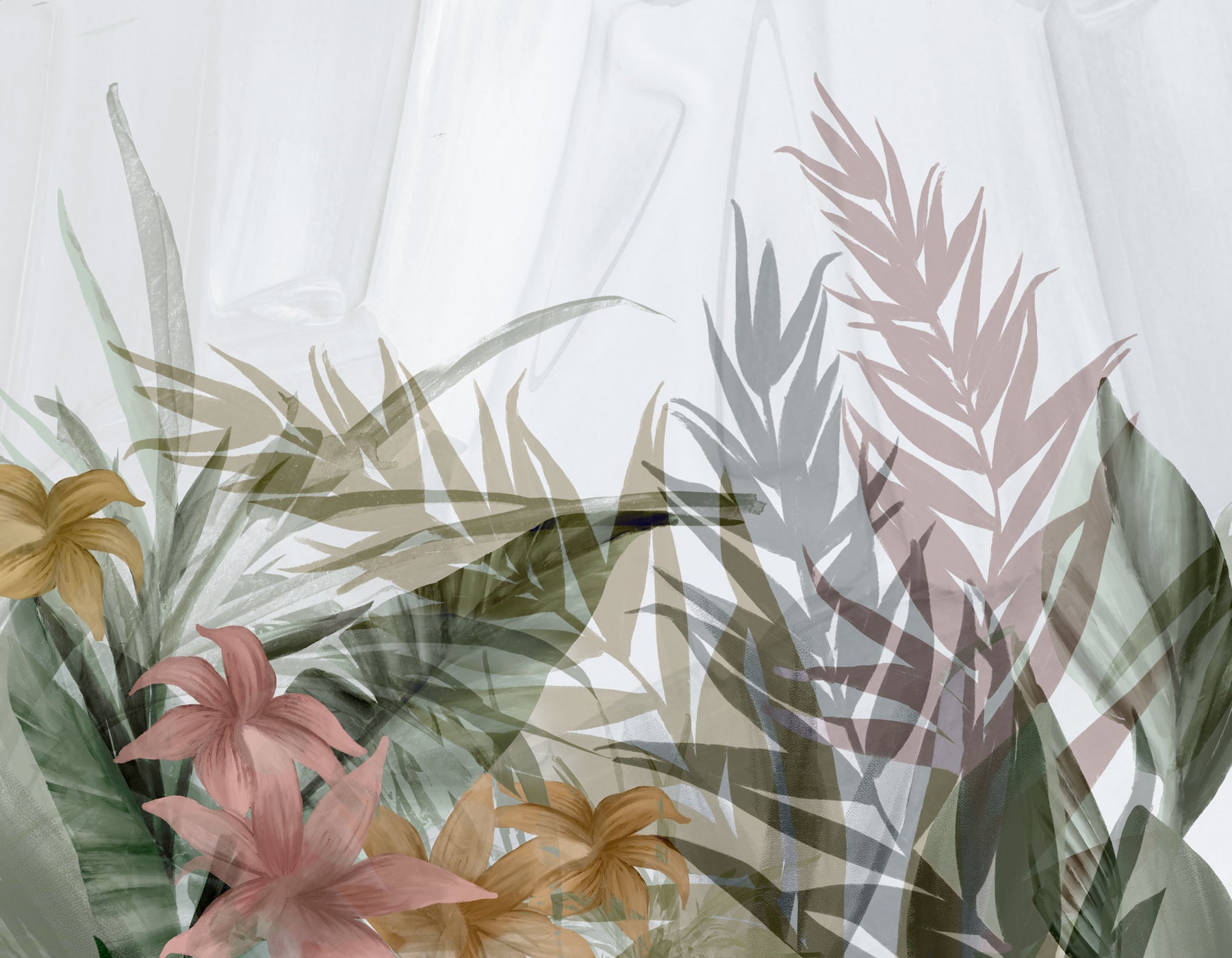 Refresh your interiors with watercolor tropical leaf wallpaper. This botanical mural brings a natural vibe to any room, featuring soft, hand-painted tropical leaves and flowers in earthy tones. The muted greens, pinks, and beiges create a calming, modern look, perfect for living rooms, bedrooms, or offices. The watercolor leaf wallpaper blends effortlessly with bohemian and minimalist styles, while the muted floral wall covering adds a subtle touch of elegance. Ideal for nature lovers, this nature-inspired wallpaper for walls brings the beauty of the outdoors inside, offering your space a fresh, organic look.