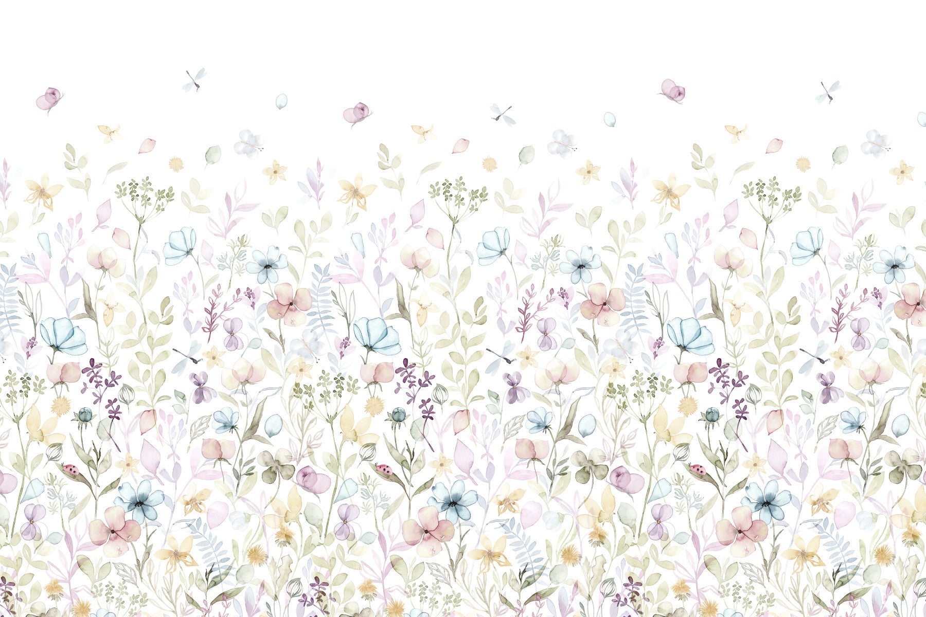 Invite a gentle, airy feel into your home with this watercolour floral design. The delicate brushstrokes form a meadow of pastel blues, yellows, greens and purples. Butterflies and dragonflies dance amongst the blooms, creating a calming atmosphere. This wallpaper for walls works well in bedrooms, nurseries, or bathrooms. The soft colours and intricate floral pattern complement minimalist or bohemian interiors, adding a touch of organic charm.