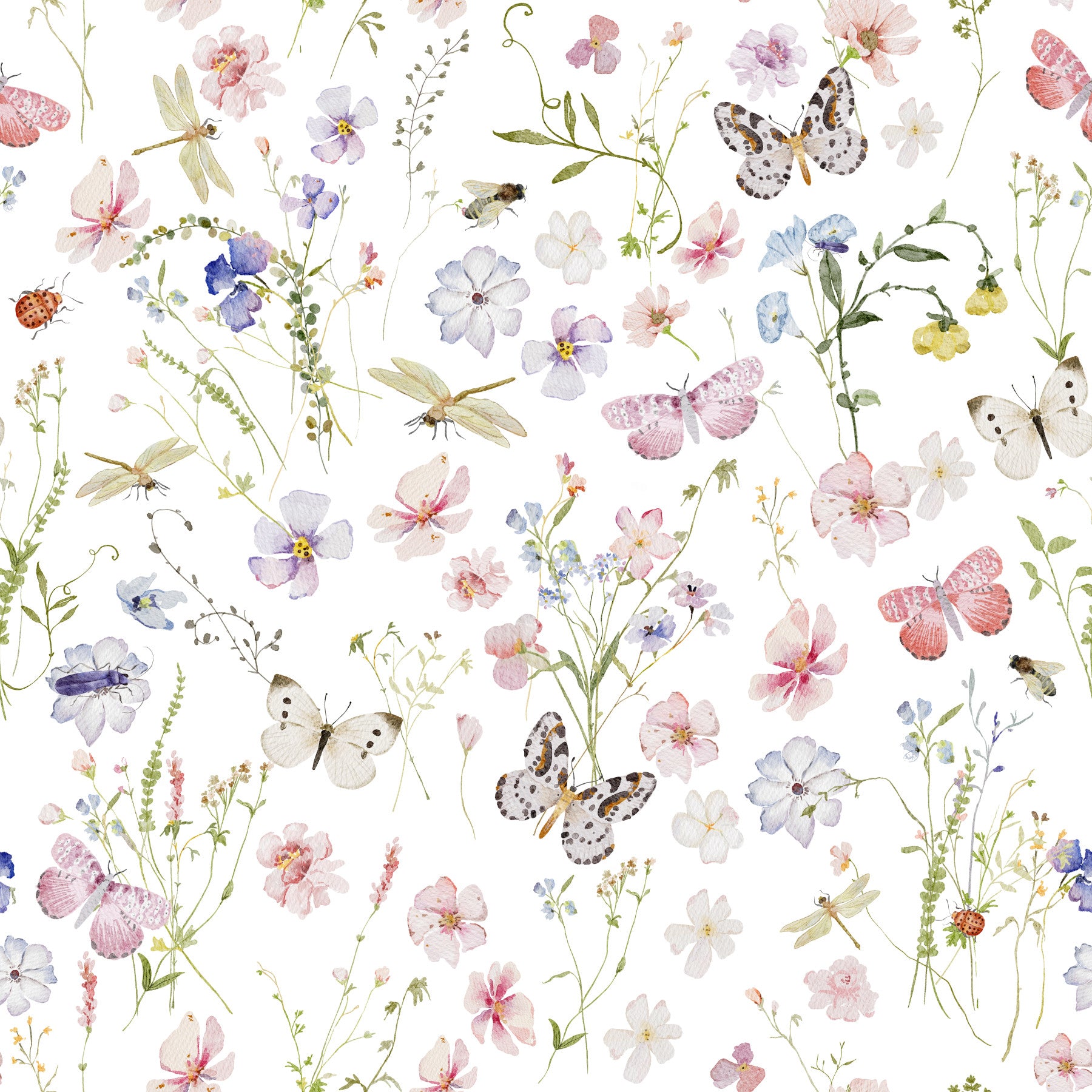 Bring the charm of a sunlit meadow inside with this delicate floral wallpaper for walls by Uta Naumann. It displays a watercolour design, filled with dainty flowers, butterflies, and dragonflies in soft shades of pink, blue, and green. The light background enhances the detail of each element. Ideal for bedrooms, nurseries, or living rooms, this wallpaper adds a touch of serenity and natural beauty to any interior. The seamless pattern lends itself nicely to interiors and will complement both modern and classic decors.