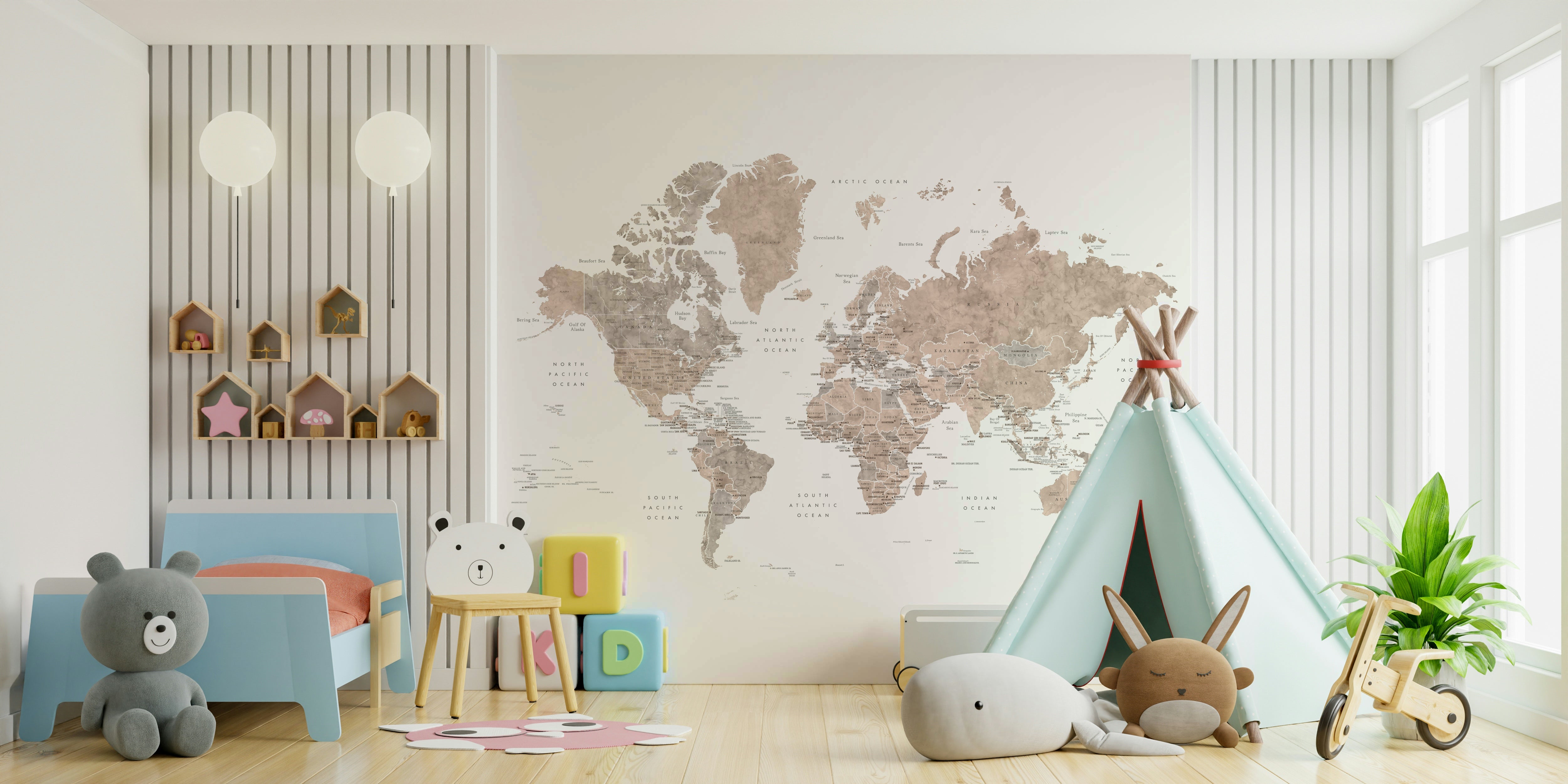 Add a colorful twist to your wall with the Watercolor World Map with Countries and Capitals – Abey. This detailed wall mural showcases country borders, capital cities, and continents in a soft watercolor palette, perfect for study areas, kids' rooms, or home offices. It's a great visual guide for geography lovers and curious minds. The map blends artistic charm with educational value, making it both stylish and practical. Ideal for those looking to add a thoughtful world view to their wall design.