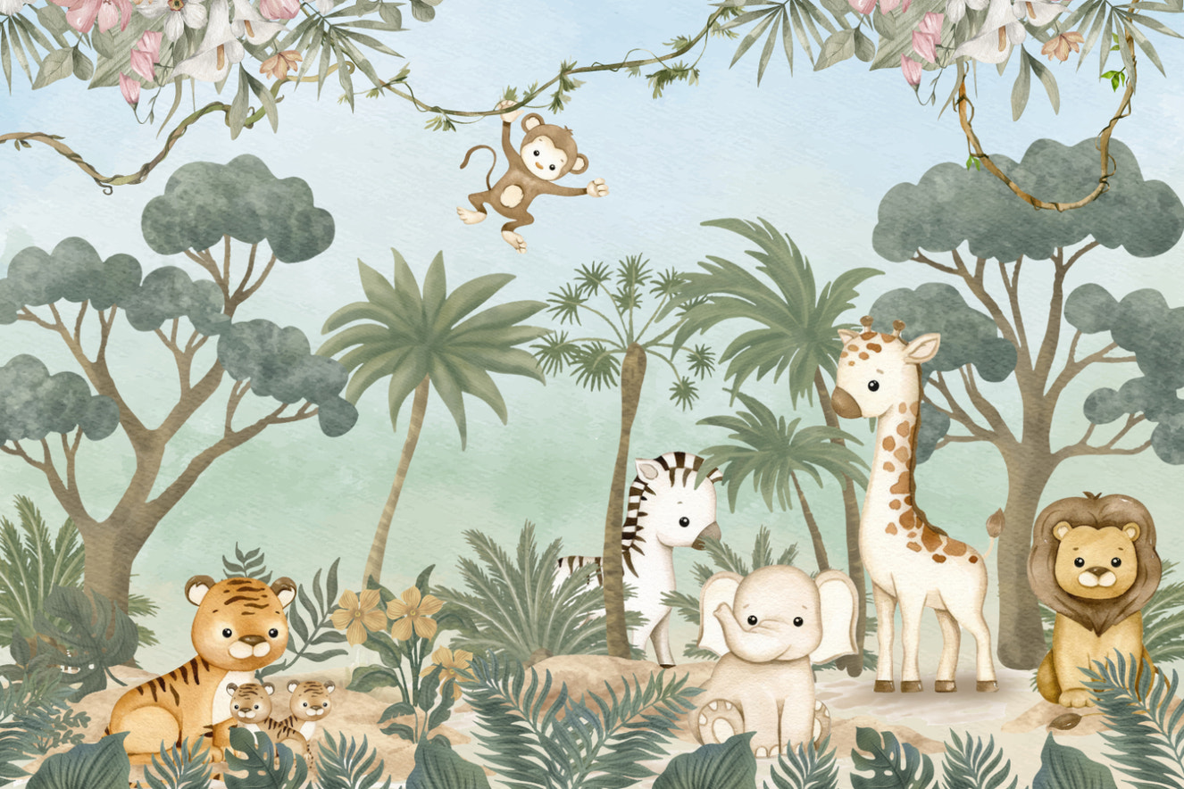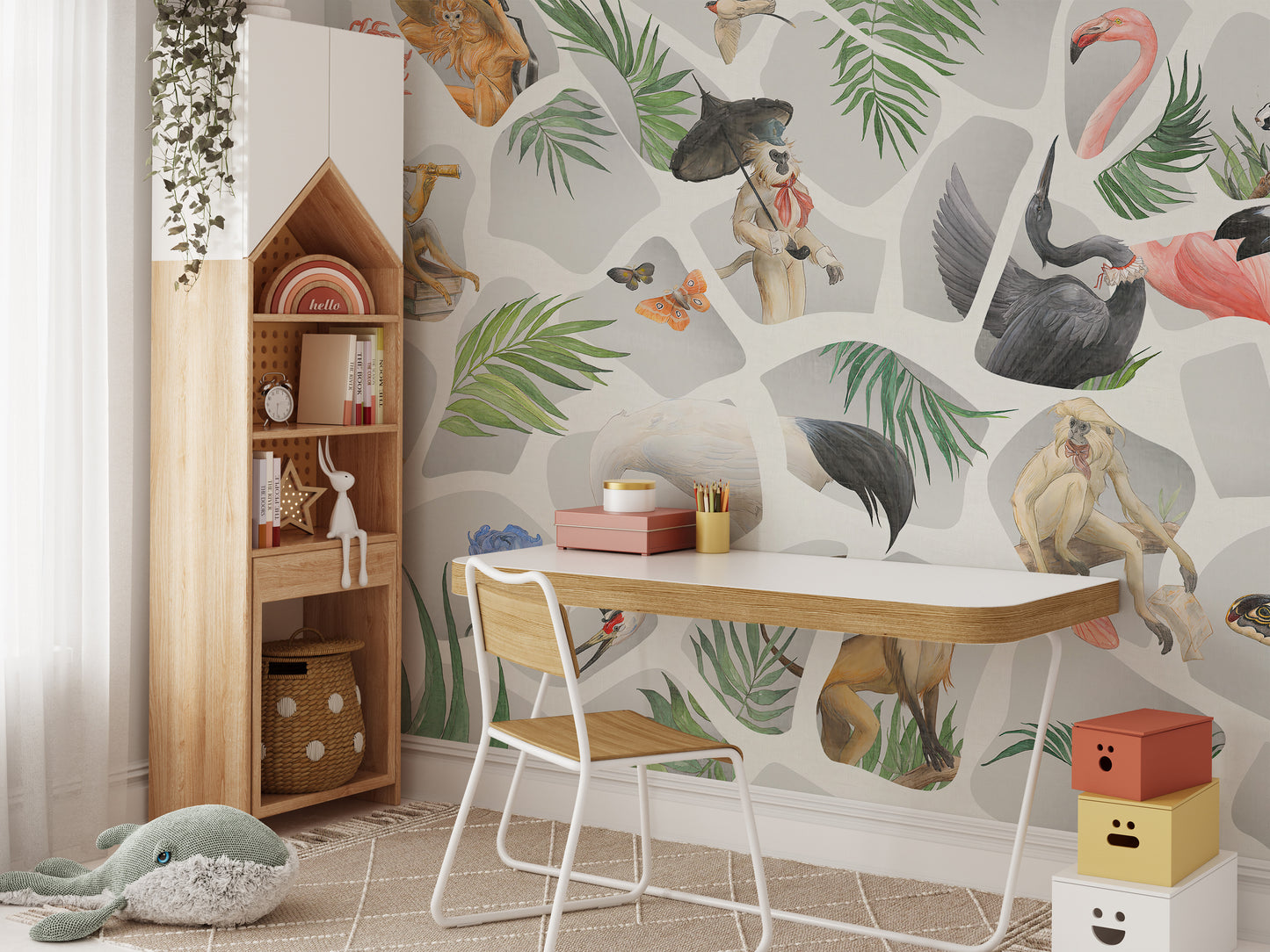 Bring the animal kingdom into your home with this stunning watercolor gray monkey & birds mural wallpaper. This playroom wallpaper is perfect for adding a touch of playful elegance to your space. The subtle shades of gray help to create a calming atmosphere while the intricate details of the monkey and birds truly make the mural come to life. Whether you use it as a backdrop for imaginative play or to add a touch of whimsy to your living spaces, this gray wallpaper is sure to impress. So why settle for a boring blank wall when you can transform it into your own personal work of art?