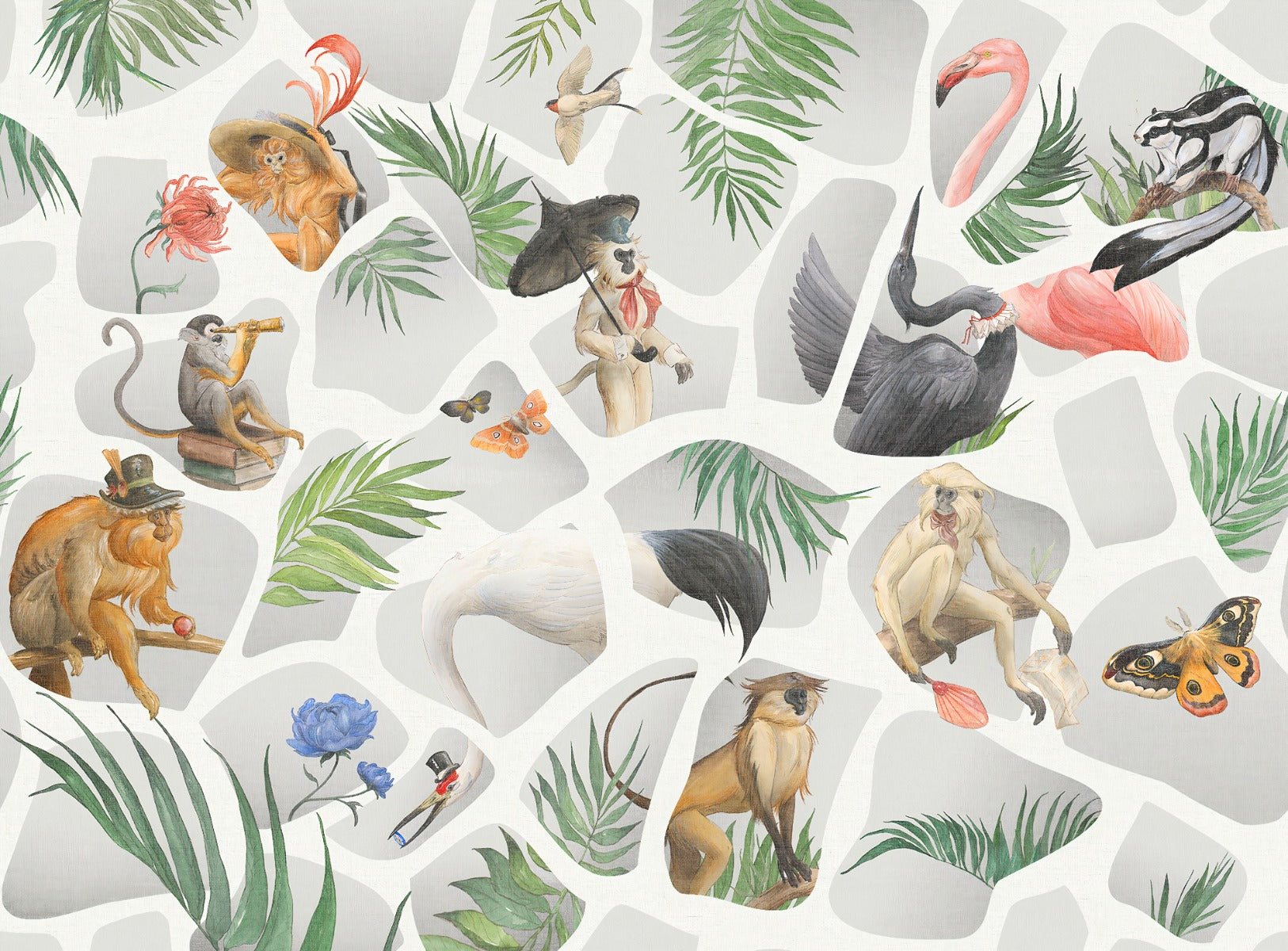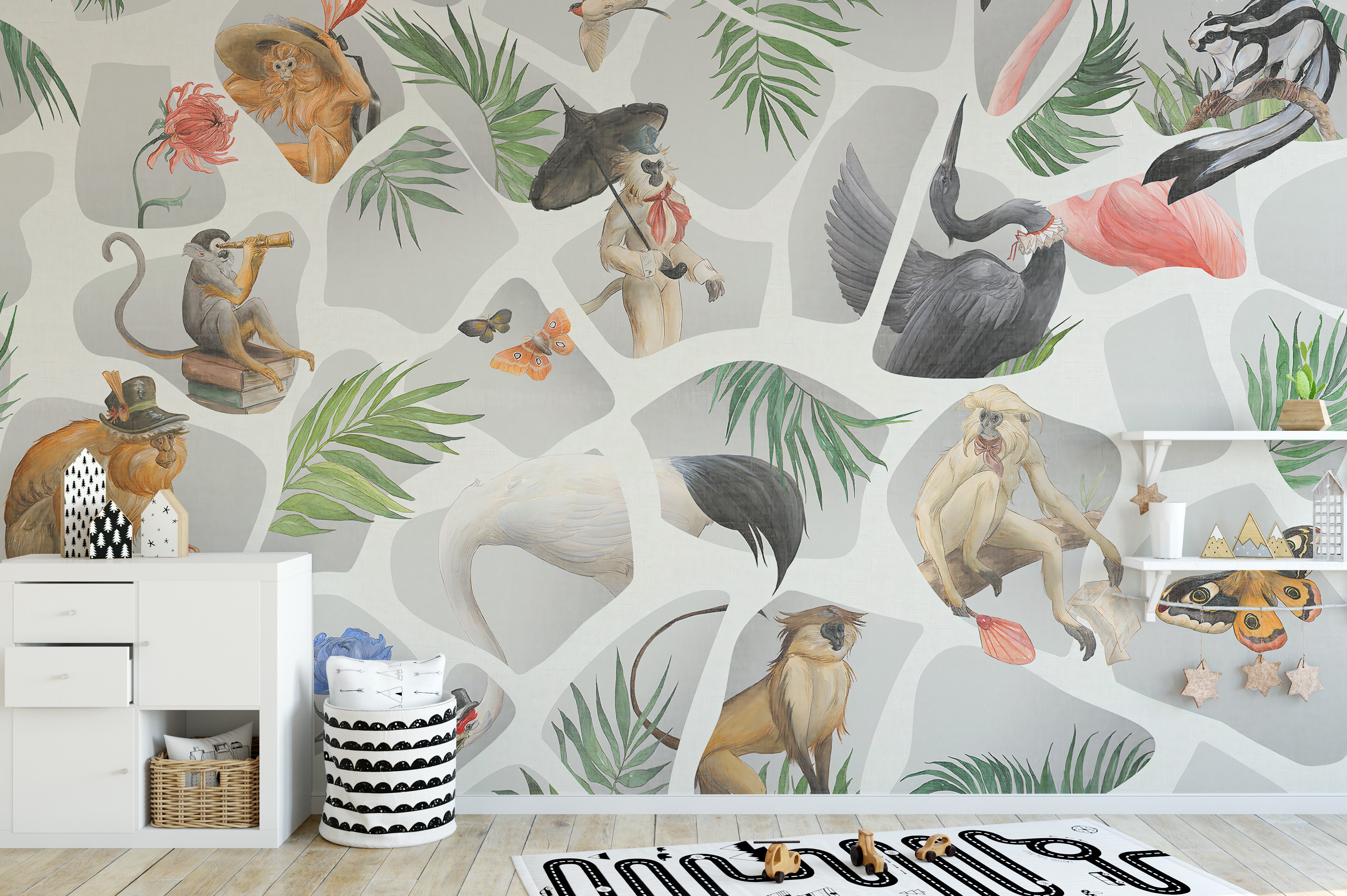 Subtle gray wallpaper mural with monkeys and birds in watercolor.