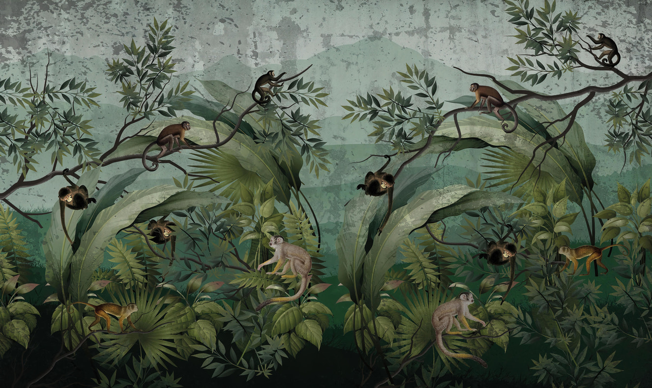 Sophisticated watercolor mural featuring monkeys and birds in gray.