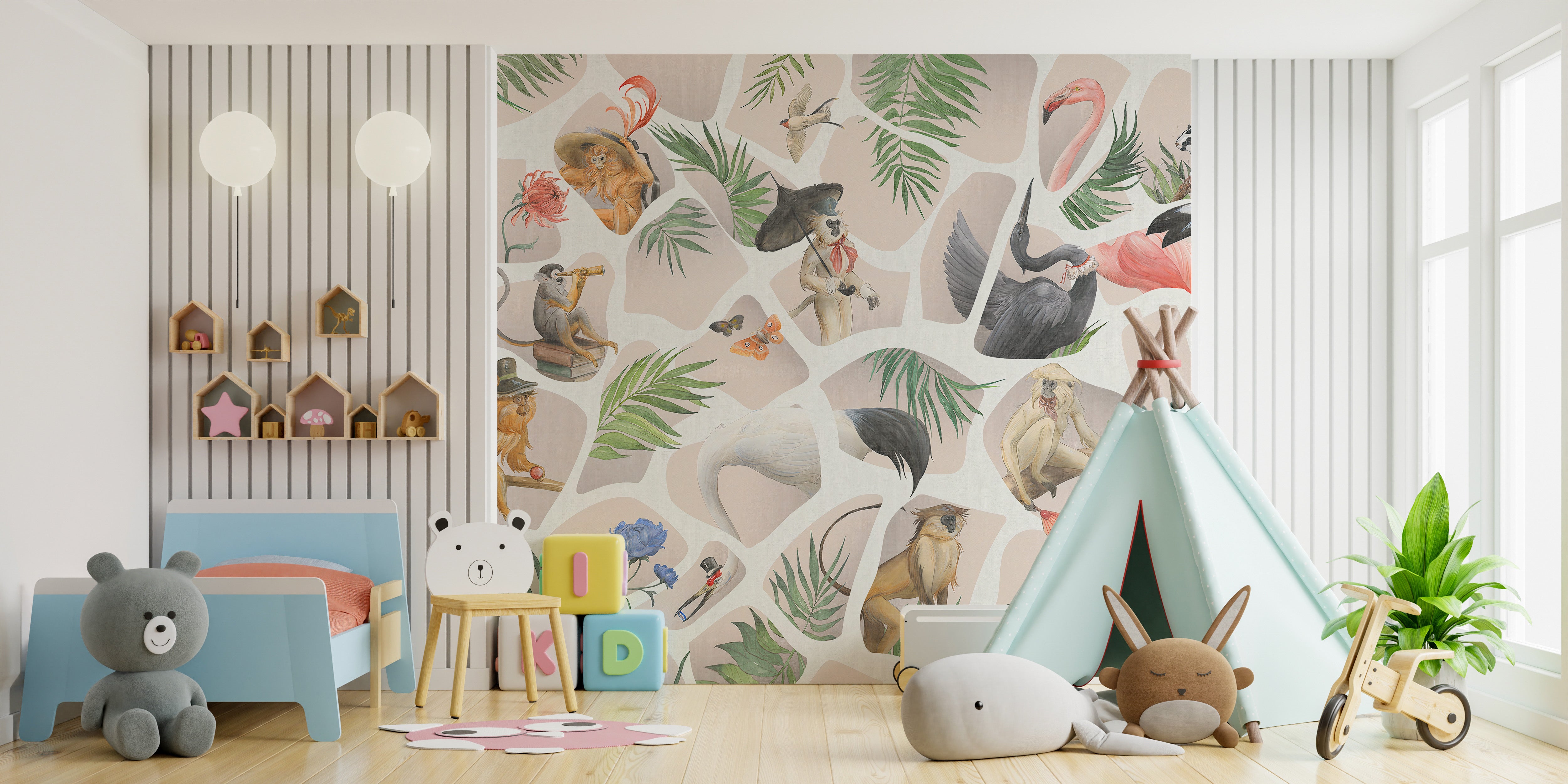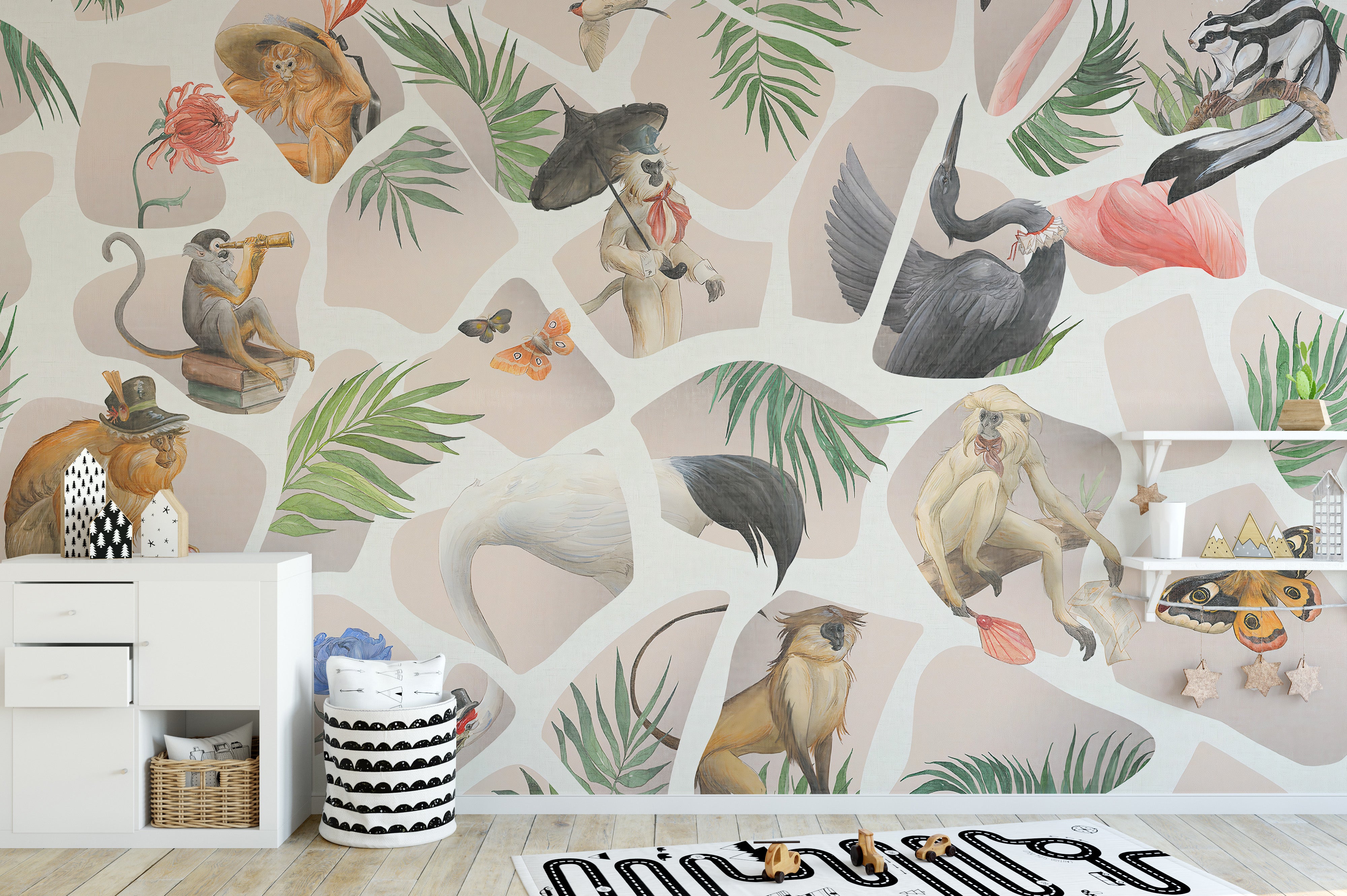 Light pink monkey and birds mural for playful yet elegant spaces.