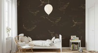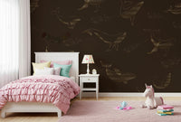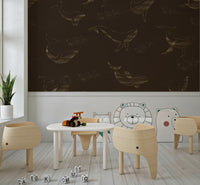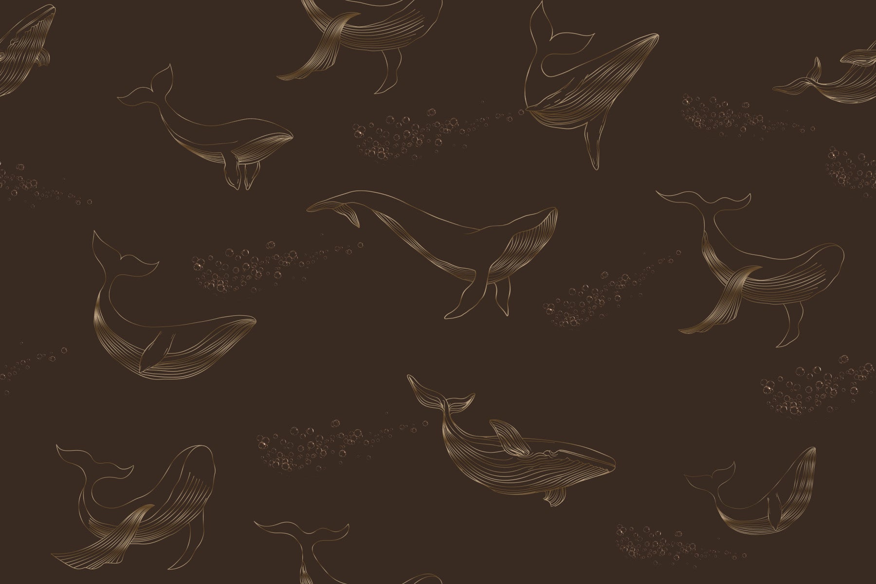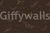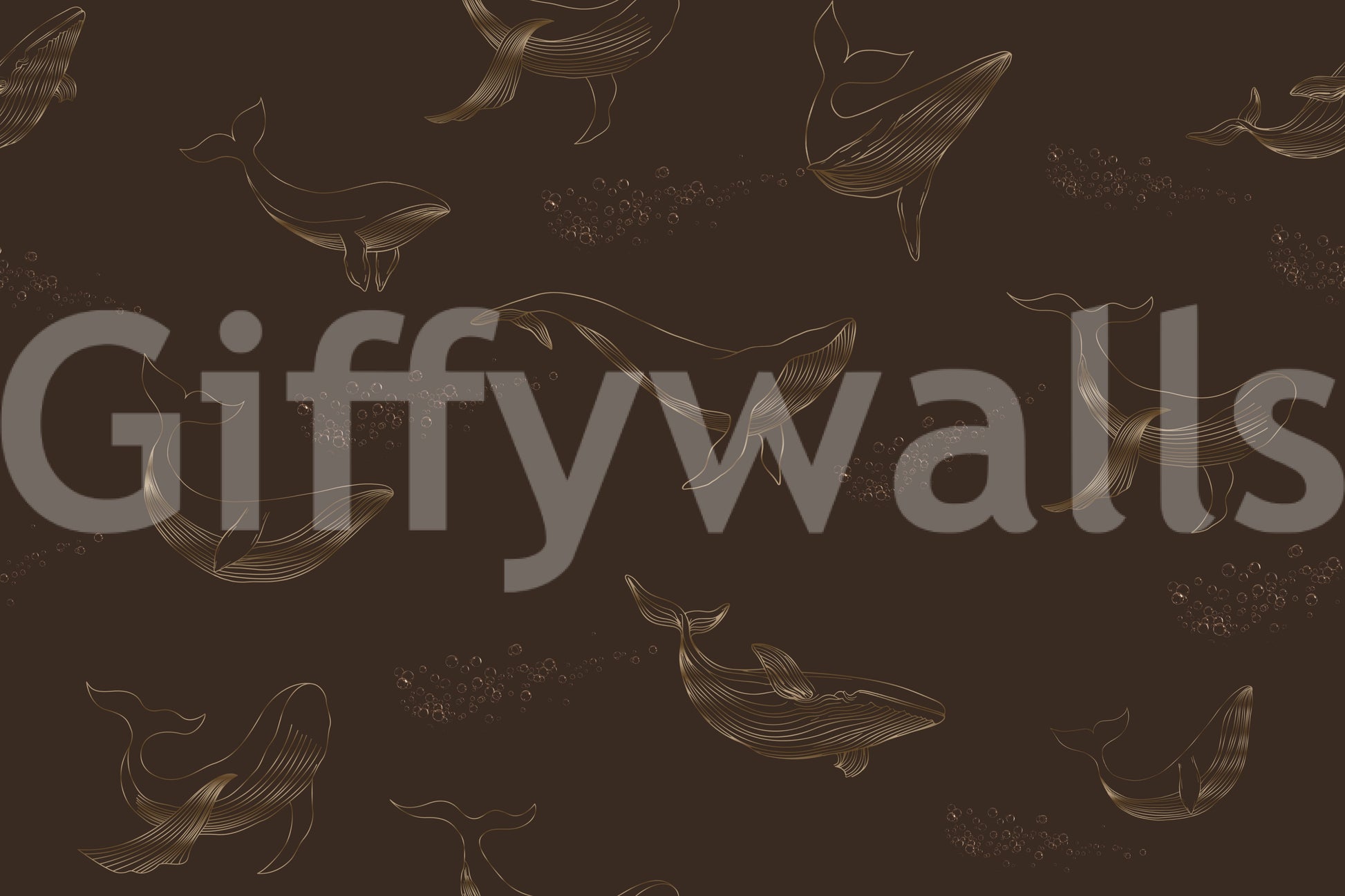 Immerse yourself in the deep with this graceful whale motif. This wallpaper for walls features stylised whale outlines in a warm gold hue swimming across a rich chocolate background. The understated palette brings sophistication to any room, making it perfect for a calming bedroom, a stylish living room, or even a serene home office. This design's elegant lines enhance the architectural details of your space, creating a subtle yet captivating focal point. Gentle bubbles add a whimsical touch, completing this sophisticated, marine-inspired wall decor.
