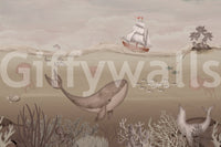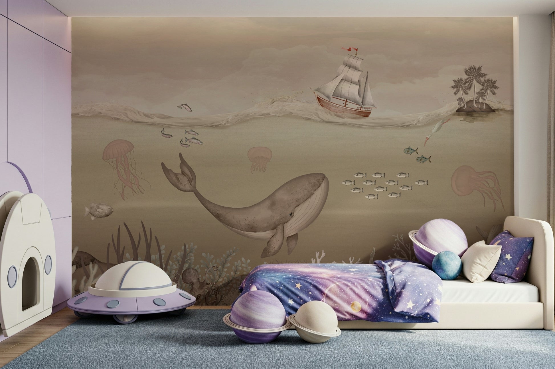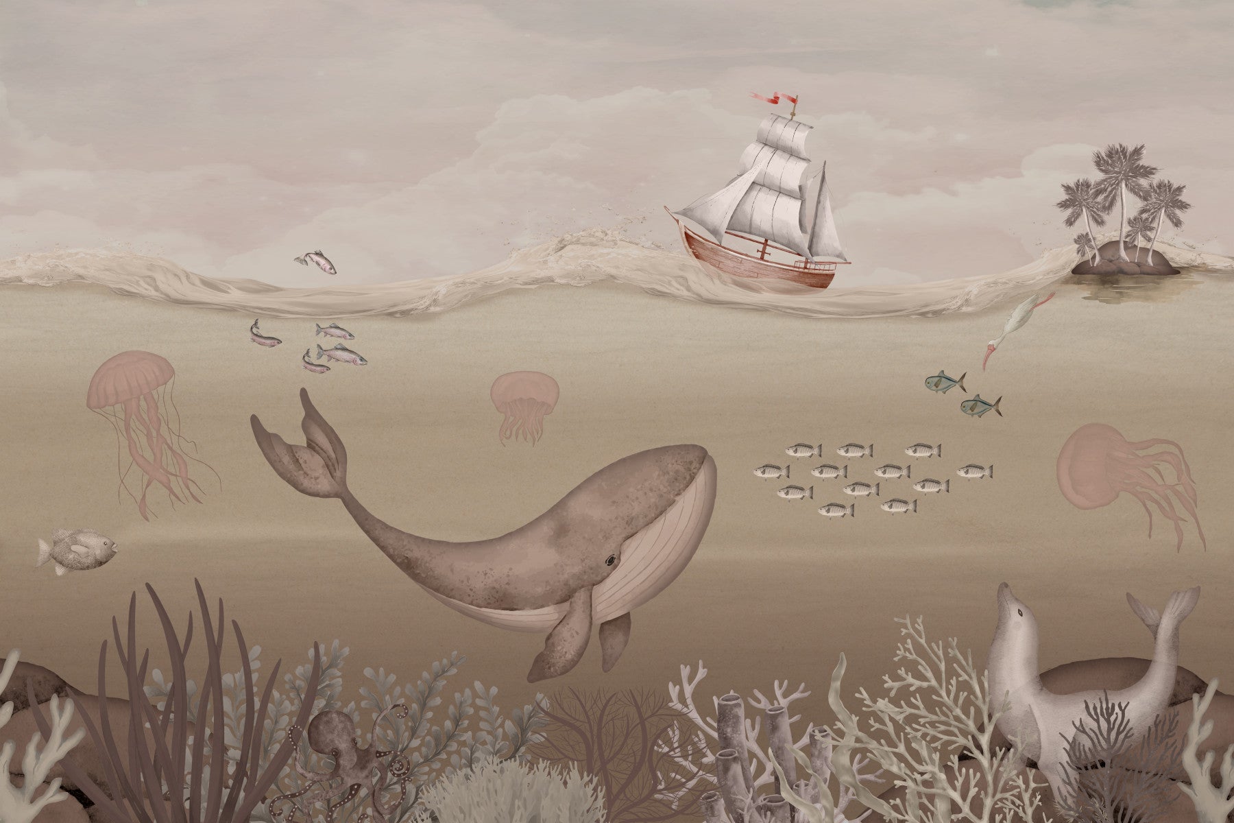 Embark on a captivating journey with this underwater scene! A majestic whale glides through serene waters alongside colourful sea creatures and a classic sailboat. The gentle tones create a tranquil mood perfect for bedrooms, nurseries, or bathrooms. This wallpaper for walls brings a touch of nautical charm to interiors while providing a calming backdrop. Soft, muted colour palette is soothing to the eye.
