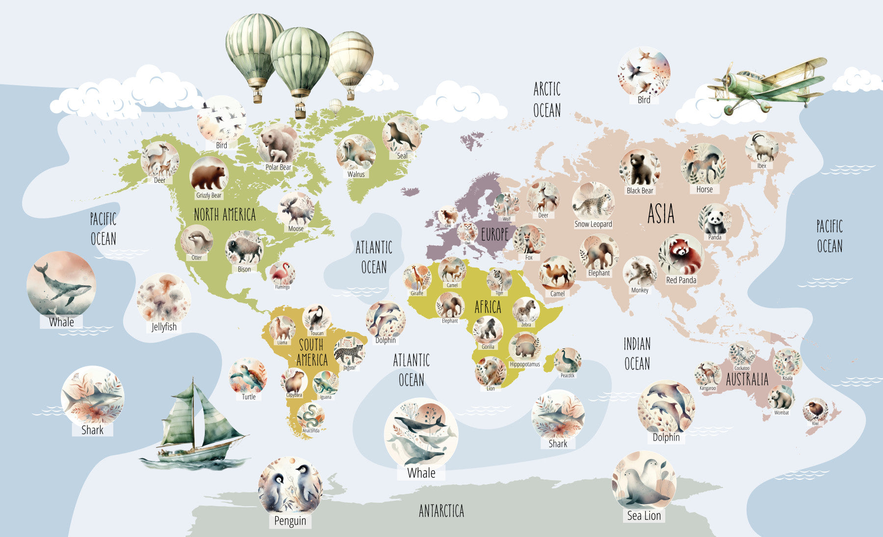 Explore the globe with this playful world map featuring charming watercolor animals! This delightful design adds a touch of whimsy and education to any space. Soft pastel hues blend seamlessly, creating a soothing atmosphere. Perfect for nurseries, kids' rooms, or playrooms, this wallpaper for walls sparks curiosity and imagination. Enhance your children's room, bringing a sense of adventure indoors. The hand-drawn style complements both modern and classic interiors.