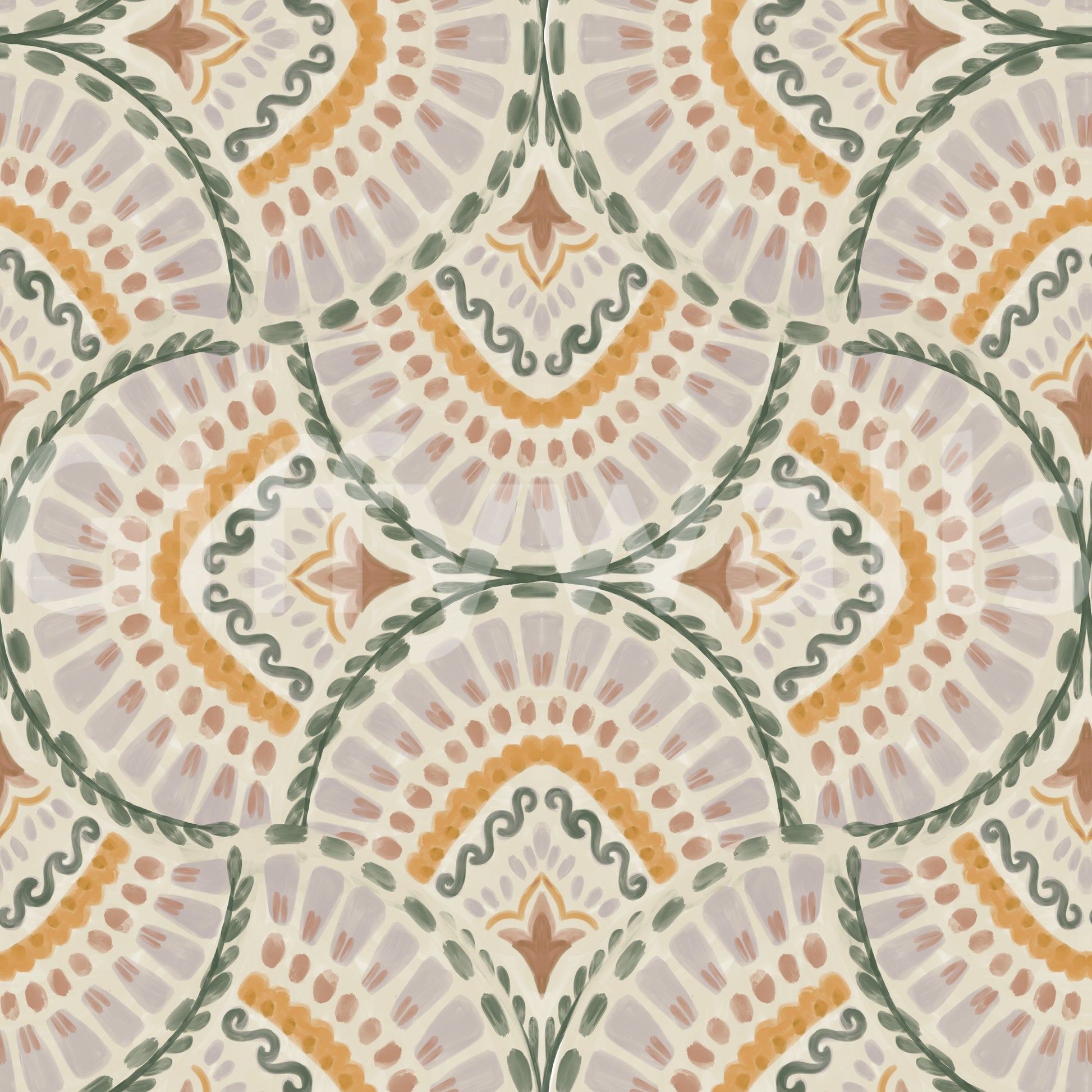 This whimsical wallpaper showcases a captivating fan-shaped pattern, bursting with a harmonious blend of pastel and earthy tones. Delicate brushstrokes in shades of beige, lavender, soft green, and muted orange create a sense of airy lightness. The repeating pattern, reminiscent of hand-painted tiles, adds a touch of vintage charm while maintaining a contemporary feel. Ideal for creating a serene and playful atmosphere in nurseries, bedrooms, or living areas, this wallpaper infuses any space with understated elegance and artistic flair.