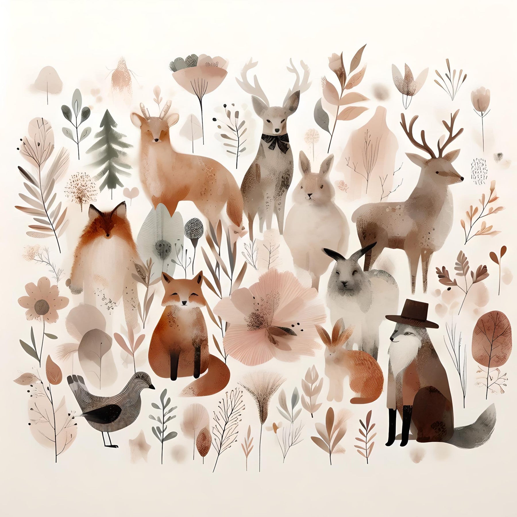 Embrace the serene beauty of the forest with this whimsical wallpaper. Delicate watercolor brushstrokes depict a charming gathering of woodland creatures – deer, foxes, rabbits – amidst a soft palette of blush pinks, earthy browns, and muted greens. The hand-drawn style evokes a sense of calm and tranquility, creating a peaceful atmosphere perfect for bedrooms, nurseries, or any space needing a touch of nature's gentle spirit. The subtle details in the flora and fauna add a layer of sophistication to this charming and calming design, making it ideal for those who appreciate understated elegance and handcrafted artistry.