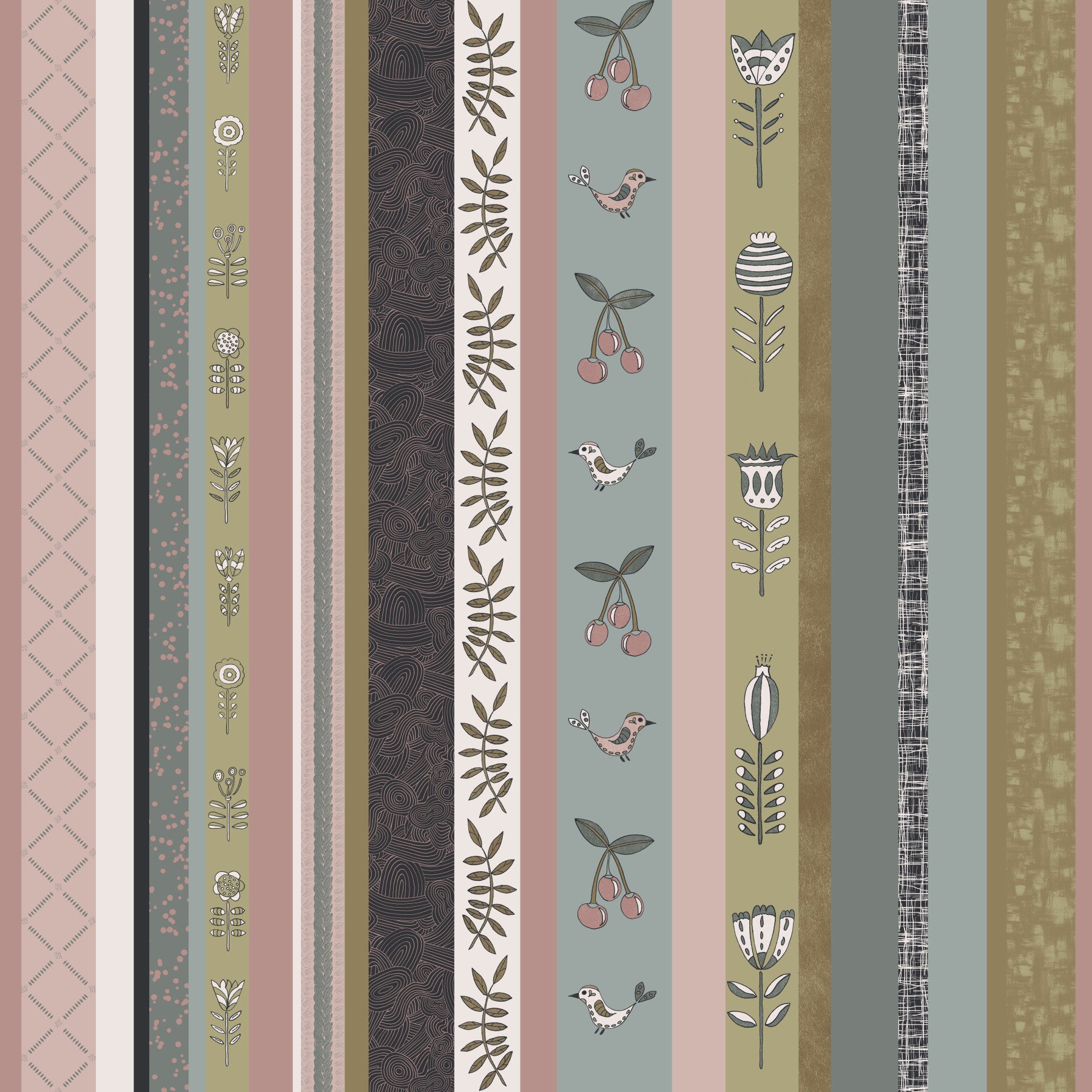 This mural wallpaper is a Whimsical Garden Stripes design, a delightful wall mural with various patterns in muted tones. It's a charming wallpaper for walls for a bedroom or children's room. The mix of simple florals, birds, and cherries with subtle textures gives your space a playful and happy feel. Made from high-quality, durable material, this mural is an easy way to refresh your home decor with a sweet and simple look.