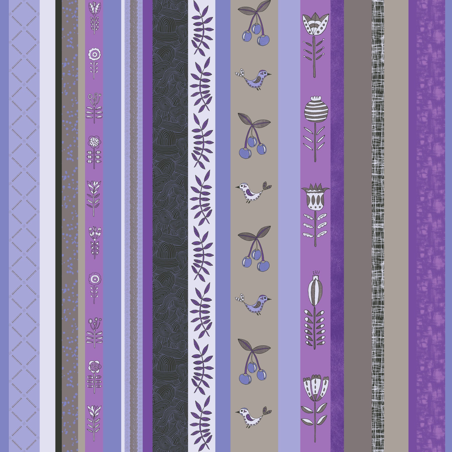 This mural wallpaper is a Whimsical Garden Stripes design, a delightful wall mural with various patterns in purple tones. It's a charming wallpaper for walls for a bedroom or children's room. The mix of simple florals, birds, and cherries with subtle textures gives your space a playful and happy feel. Made from high-quality, durable material, this mural is an easy way to refresh your home decor with a sweet and simple look.