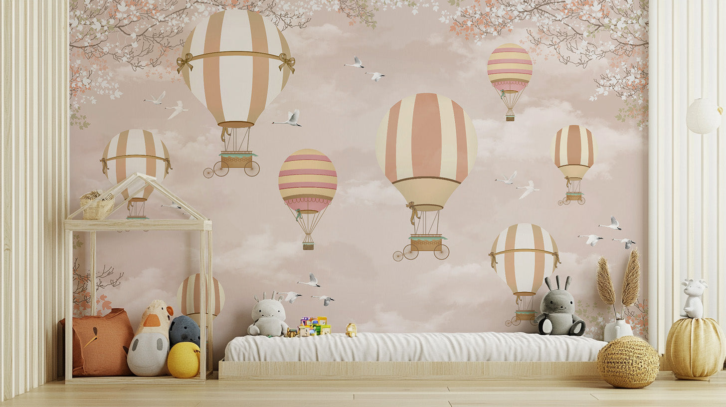 Add charm to any room with the whimsical hot air balloon wallpaper. This playful design features pastel-colored hot air balloons floating among soft clouds and graceful birds. Perfect for nurseries, playrooms, and kids' bedrooms, this hot air balloon wallpaper brings a light, airy feel to your walls. The vintage tones of beige, cream, and peach blend beautifully with various interior styles. Whether designing a nursery or updating a child's room, this whimsical kids' room wallpaper creates a fun and inviting atmosphere. Let the nursery hot air balloon mural inspire endless imagination and joy.