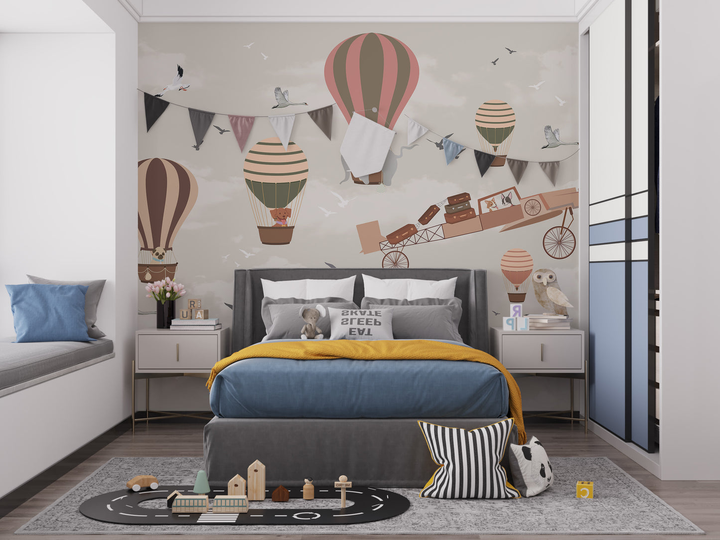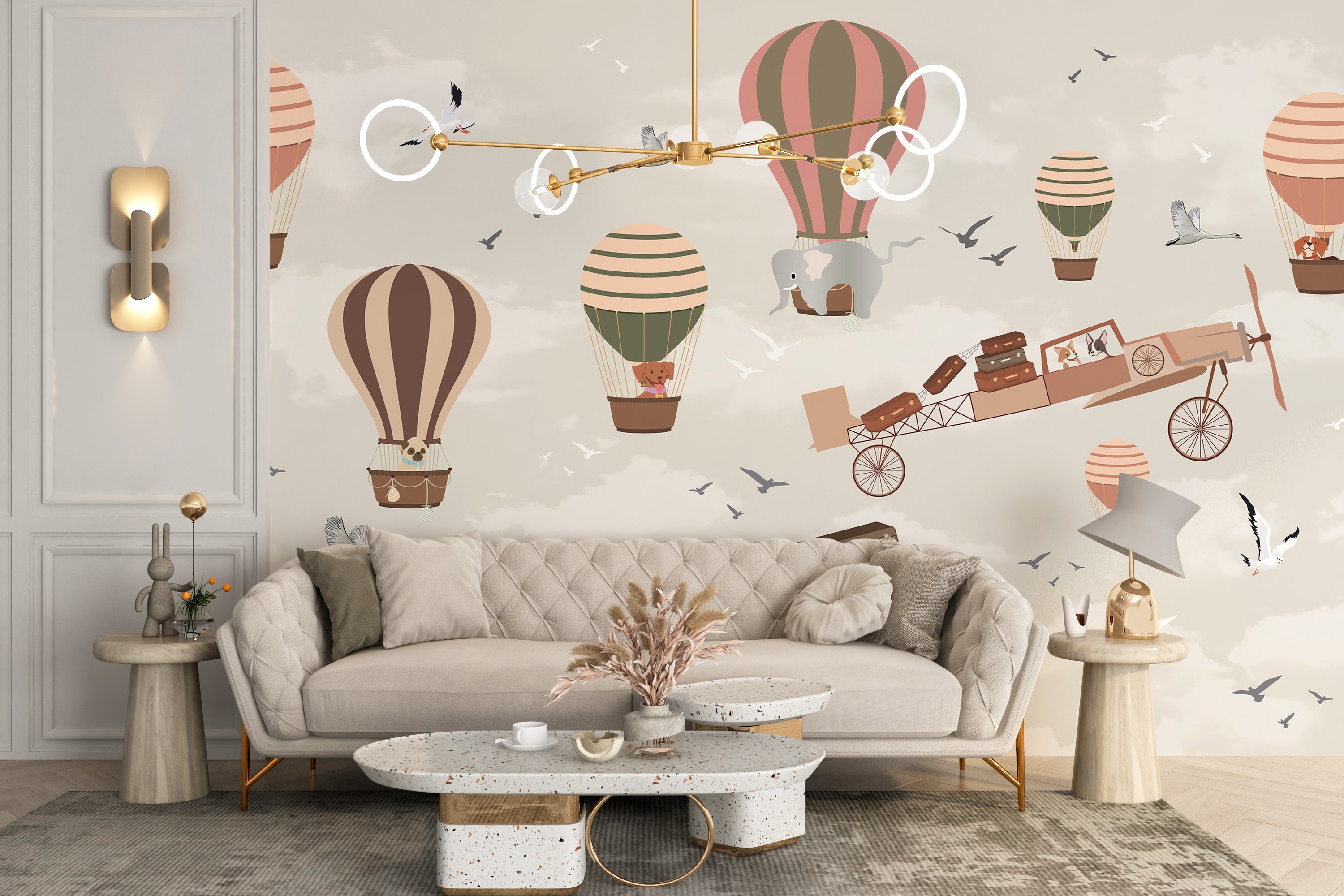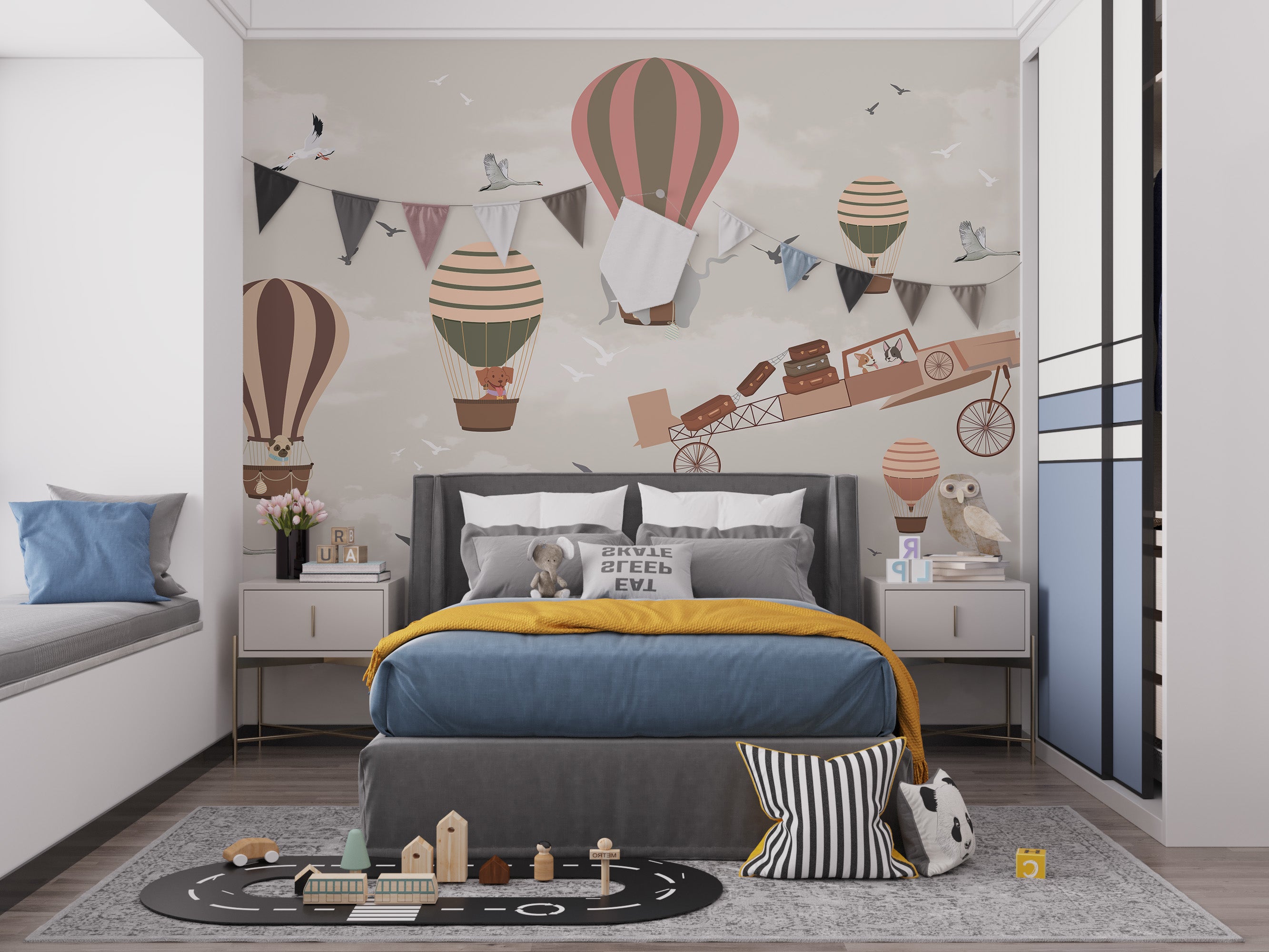 Balloon and plane wallpaper for children's themed rooms.